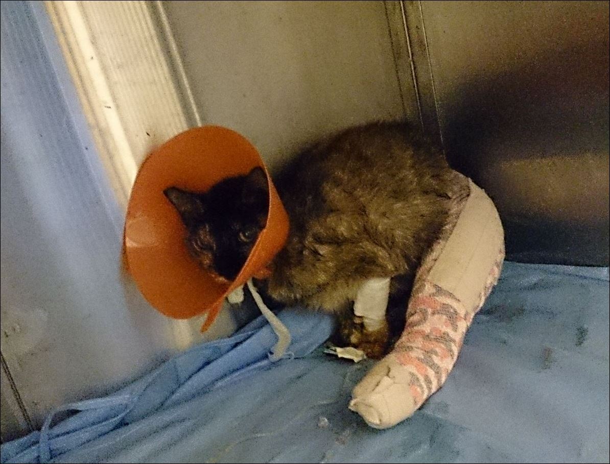 經過協會幫忙將貓咪帶往愛屋進行治療~醫生判斷是近期的傷口,要手術的話最好儘快實施,由於是粉碎性骨折手術較為複雜,但因為驗出貓瘟反應又有貧血症狀,必須隔離住院先觀察