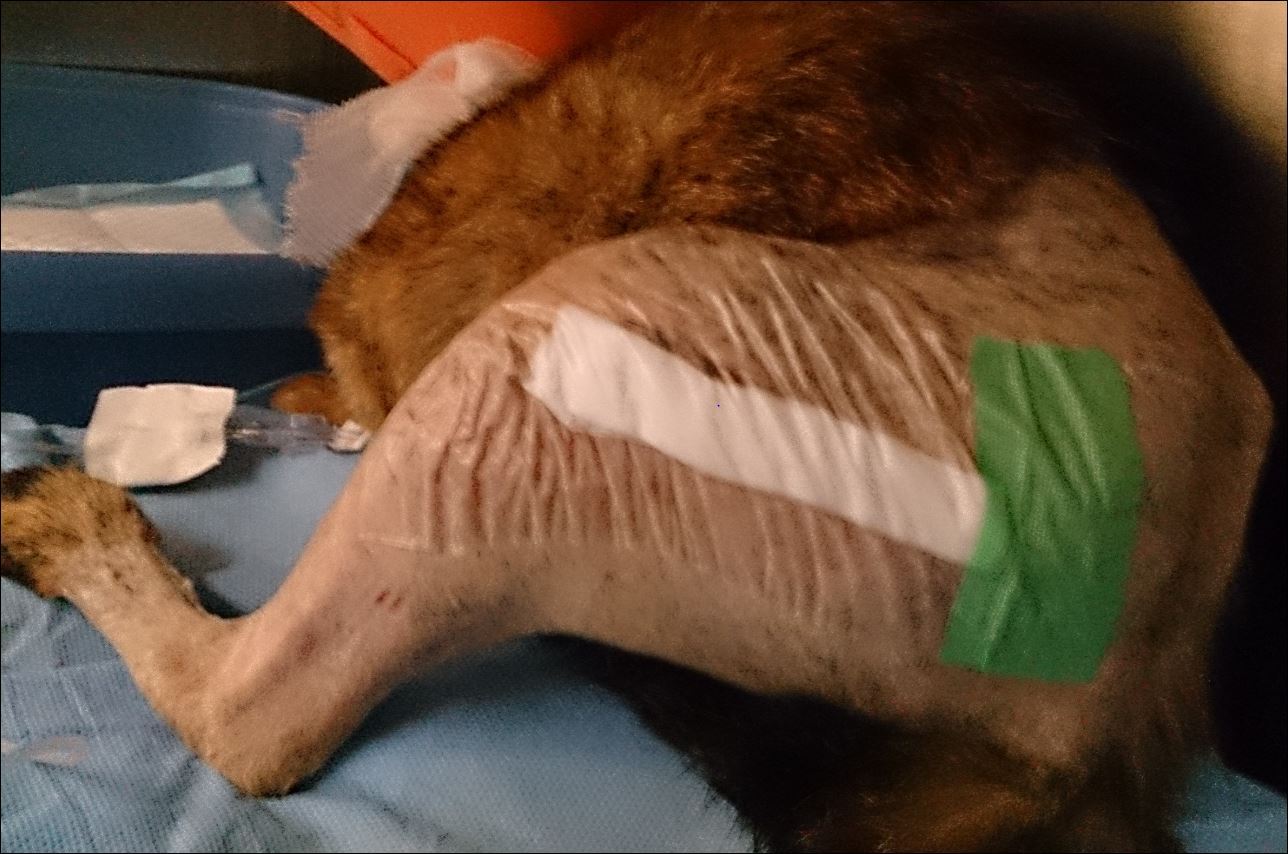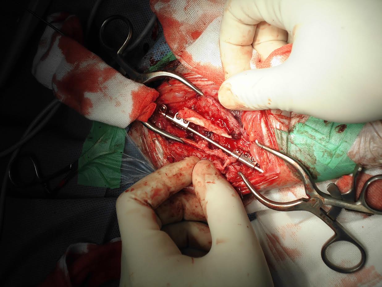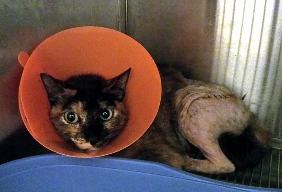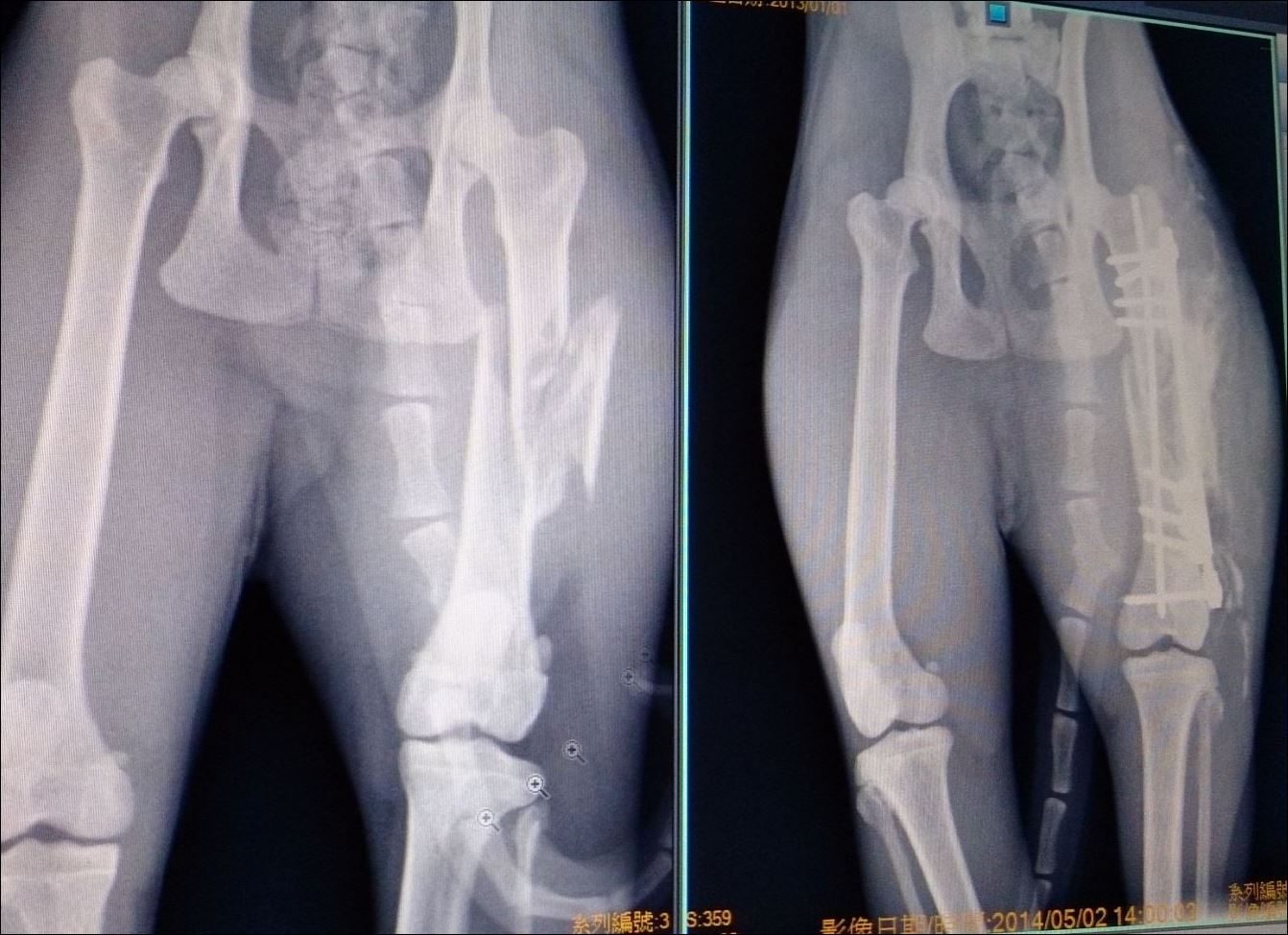 玳瑁雖也有努力的吃飯但還需偶爾灌食,住院4日後經過點滴營養輸液,貧血狀況才有好轉,進行手術也順利完成,醫生劃刀後才曉得原來斷片有四片十分棘手,利用骨板與骨釘才能固定,但因為住院期間骨頭已有生長組織,手術進行變得更困難,醫生已儘量將錯位的關節與斷片拉回..所幸術後X光確認骨折後左腳和右腳的長度只有些微得差距不會影響貓咪行走跑跳