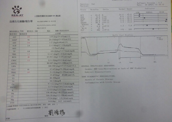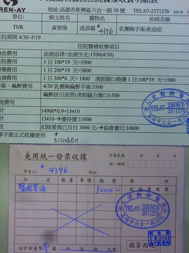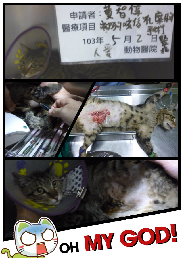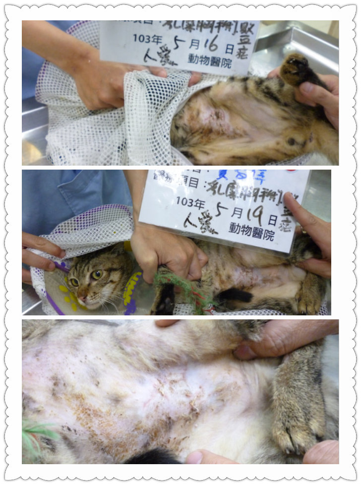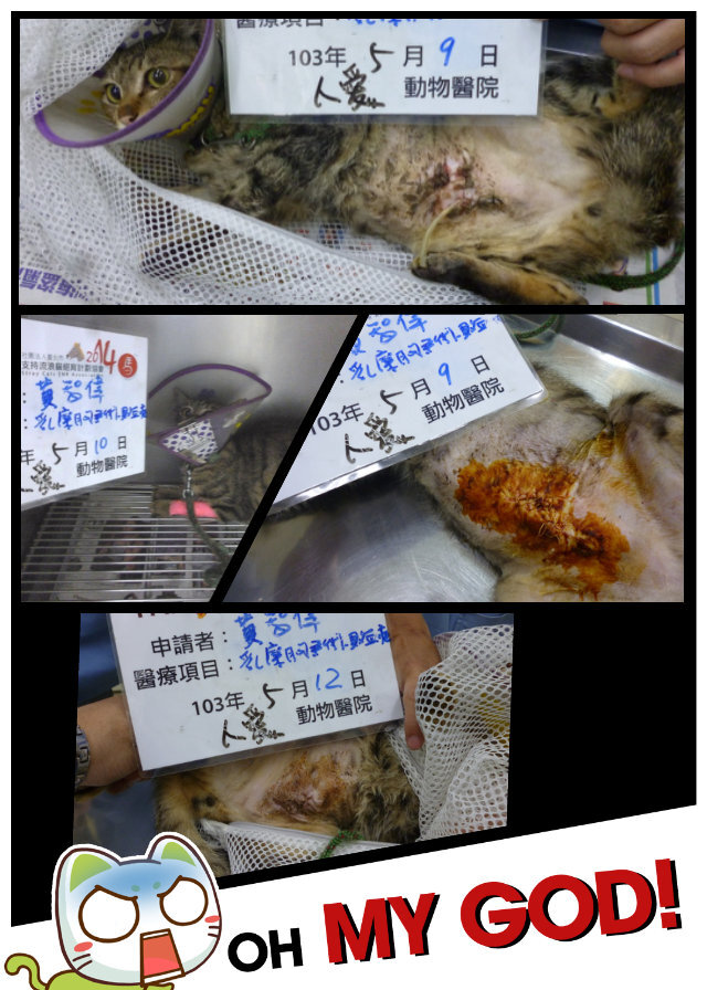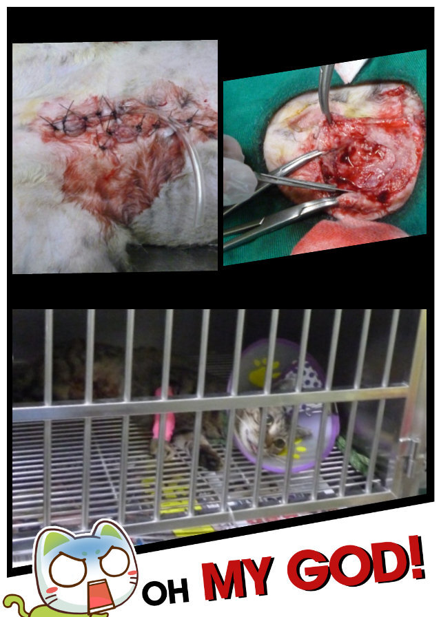 因為傷口很深至腹腔,範圍大,嚴重感染化膿~已造成乳糜胸經抽血檢查傷口潰爛處確診已引發敗血症 ~須馬上動刀麻醉清創傷口否則會有生命之危險~手術後因傷口過大深需留置引流管以利每天換藥&灌洗~在經過每天細心照顧治療及換藥,患貓狀況穩定,第二階斷需將引流管移除,但移除引流管需麻醉,引流管置處須再清創及縫合! 評估再住院治療一週才出院~~拆線後傷口非常ok且患貓精神及食慾亦非常的好!證明大家的辛苦是值得的! 醫療費用還需要大家的幫忙~