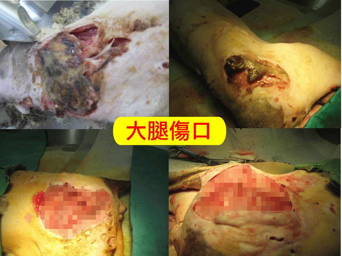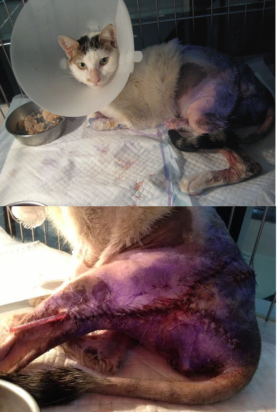 主題: 被狗攻擊大腿皮開肉綻 申請者姓名: 佘家慧 花色: 申請日期: 2014-07-05 16:35:47 申請者部落格: 申請者臉書網址: 所在縣市/合作醫院: 高雄市/新德民動物醫院 治療費用: 22600元 需求人數: 25人 已結案 (2014-08-05 11:02:59) 報名人員: Cassie Lo(已付款)、Slowsnow Hsu(已付款)、楊齊拉(已付款)、Victoria Liou x2(已付款)、Ou Han x2(已付款)、小四(已付款)、Kiki Liang、Aiko Wan(已付款)、certifi x5(已付款)、Sonia Tseng(已付款)、櫻花妹(已付款)、阿曄(已付款)、白婷(已付款)、Kuen-Lin Tsai(已付款)、恆均(已付款)、Stephen(已付款)、Irene x2(已付款)、嫘煖(已付款)、shuku點點(已付款)、 候補人員: 動物病情說明: 這隻貓被3隻野狗攻擊,傷勢非常嚴重,受傷部位已嚴重潰爛發出惡臭。經由醫師判斷後,發現其傷口感染嚴重,必須進行清創手術,清創3天後如醫師所料,一部份傷口無法完全癒合,但考慮到該患部皮不夠清創使用,所以決定不進行第二次清創手術。