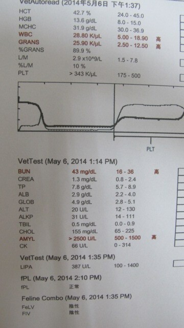 血檢顯示白血球過高,胰臟指數偏高,無食慾