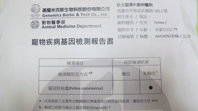 5/21醫生表示不排除FIP的可能,經討論決定送驗FIP