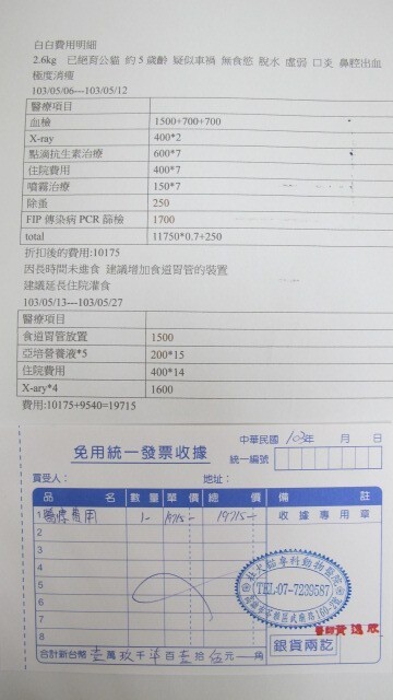 5/27白白出院嘍,費用明細如最後一張照片