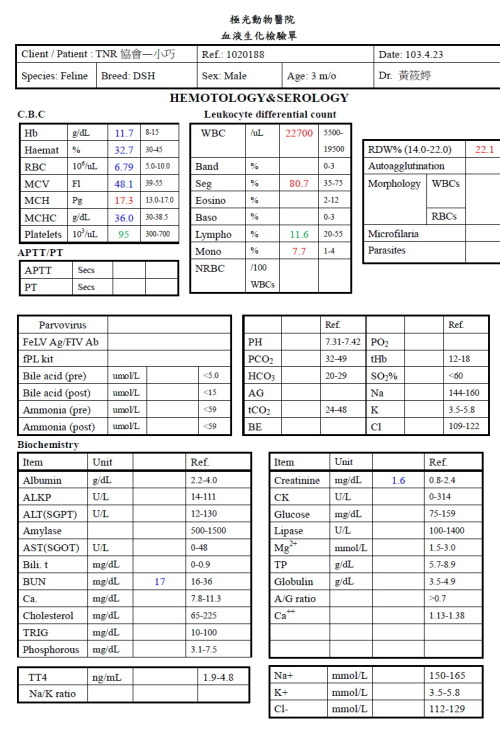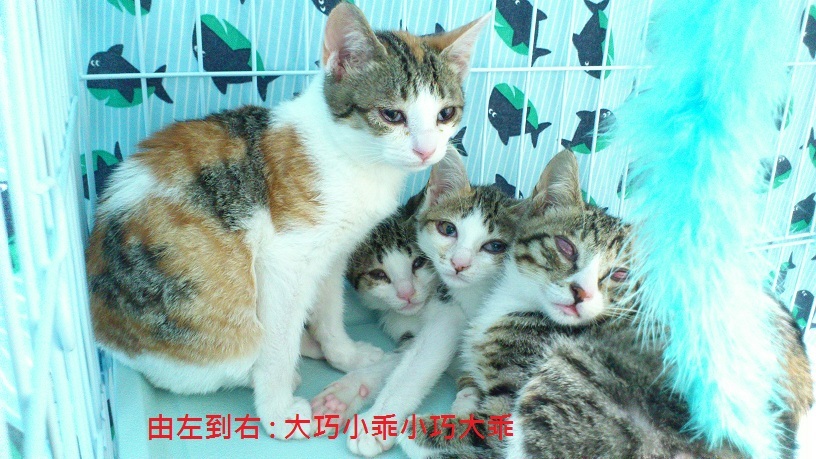 主題: 嚴重眼睛發炎鼻塞不肯進食的四小貓 申請者姓名: 臺北市支持流浪貓絕育計劃協會 花色: 申請日期: 2014-05-09 22:12:02 申請者部落格: 申請者臉書網址: 所在縣市/合作醫院: 台北市/極光動物醫院 治療費用: 19720元 需求人數: 22人 已結案 (2014-06-20 16:36:50) 報名人員: Tetsu(已付款)、白婷(已付款)、Bouney、賴小狗(已付款)、人緣沒(已付款)、QQ(已付款)、張志宇(已付款)、April Tsung(已付款)、張良棋(已付款)、米莉、Vincent x2(已付款)、Yiwei Chien、Ppn Huang(已付款)、shuku點點(已付款)、謝小芬、豬妞妞(已付款)、Emily Chou x2(已付款)、lavinia x3(已付款)、Fg Jan(已付款)、iMADOKA(已付款)、Chris Chen(已付款)、Jasmine Lin(已付款)、 候補人員: 動物病情說明: 民眾通報協會屋頂上有小貓和大貓,希望可以捕捉結紮,志工協助捕捉大貓,同時發現小貓有鼻氣管炎的現象,還好仍有食慾,設籠捕捉,就診後安置於協會,因天氣變化大,忽冷忽熱,小貓們感冒狀況時好時壞,早晚噴霧、餵藥、點眼藥水本以為狀況會慢慢改善,某日照顧員反應貓咪眼睛紅腫外翻,連最喜歡的罐頭都不願意吃,鼻塞情況加重,眼睛像拍恐怖片一樣嚇人,一量還發燒,看起來很倦,醫生建議先住院治療,第一天四小貓像說好的一樣,大家都不願意進食,醫師只好一隻隻灌食、點眼藥水,被踹的亂七八糟,第二天似乎比較習慣灌食和餵藥,慢慢把口服藥加再罐罐裡也願意吃,監控體溫也回到正常,大乖大巧復元狀況良好住院後八天先出院。而小巧進食狀況仍不穩定,血檢發現白血球過高22700,改口服抗生素後狀況比較穩定,兩天後也出院,而狀況最嚴重的小巧仍留院治療。