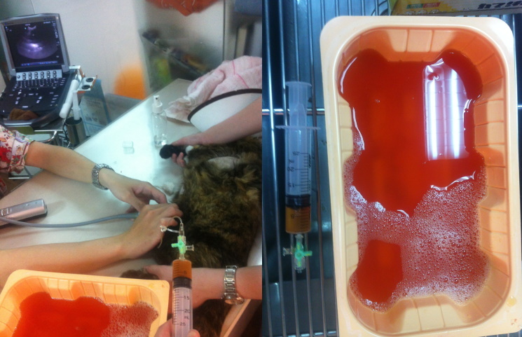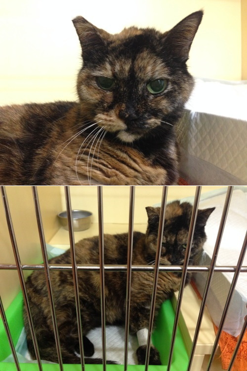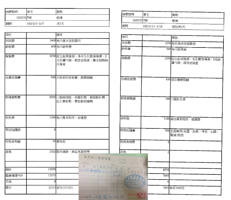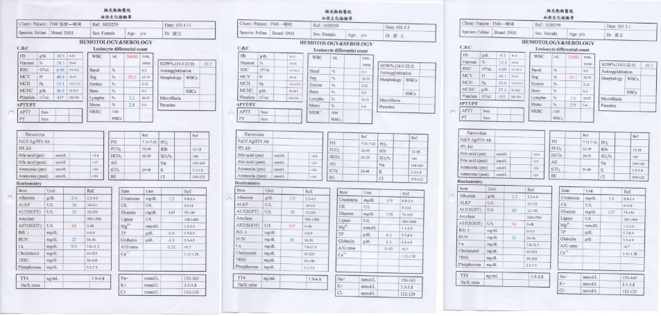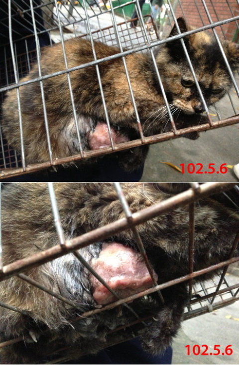 貓至醫院後(102.5.6),馬上安排檢查,發現不只乳腺腫瘤問題,腹腔也有疝氣及卵巢腫瘤,一並給予手術切除及治療,在醫院休養了二個月,因腫瘤為惡性,有擴散現像,並不適合再野放,通知志工,安排接出院安置後續照顧。
