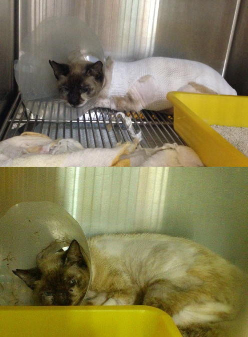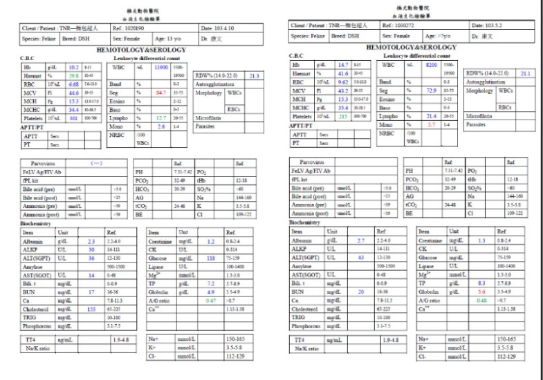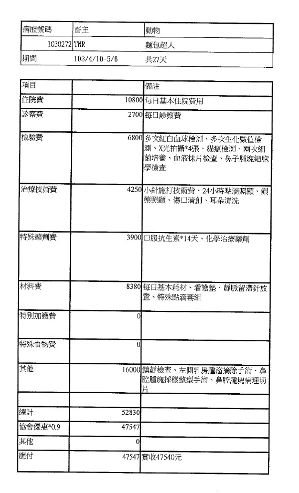 主題: 乳房腫瘤鼻子腫大的麵包超人 申請者姓名: 臺北市支持流浪貓絕育計劃協會 花色: 申請日期: 2014-05-12 02:16:05 申請者部落格: 申請者臉書網址: 所在縣市/合作醫院: 台北市/極光動物醫院 治療費用: 47540元 需求人數: 50人 已結案 (2014-06-20 16:36:15) 報名人員: みやびしゅう x2(已付款)、玥青(已付款)、林稚婷(已付款)、Nora Liu(已付款)、小娟(已付款)、Afra chen(已付款)、阿mo媽(已付款)、過 客(已付款)、大聲說 x10(已付款)、Ray0322(已付款)、ellen pai(已付款)、Becca Huang(已付款)、Hsu Vincent(已付款)、Jackie Kang(已付款)、簡人予(已付款)、林安妮 x2(已付款)、En Rong Shen(已付款)、Vivienne Sun(已付款)、彭大海(已付款)、林郁婷 x20(已付款)、 候補人員: 動物病情說明: 一隻貓生了病 如何在街上生活? 麵包超人 是他的新名字 新身份 希望他能過不一樣的貓生 在某區域進行TNR計劃時 遠遠看見一隻漂亮又很瘦的混暹羅走過來尋食 但她嚇壞了誘補的志工們 因為他的鼻子異常的腫大 擔心他受傷嚴重 趕緊送醫 醫生卻告知貓有乳線腫瘤!!!! 而且貓已經年記非常大了!!!!!!!! 不敢想像 他是如何帶著疼痛在外生活 其中還要面臨 .發情!打架!生育!尋食!! 經過許多的精密的檢驗跟評估後 醫生幫她切除了單邊乳線 也同時進行化療 堅強的麵麵也一路挺過來了 目前先安置在協會的安養之家 未來還需要我們跟她一起努力 希望大家能幫忙麵麵的醫療費用~