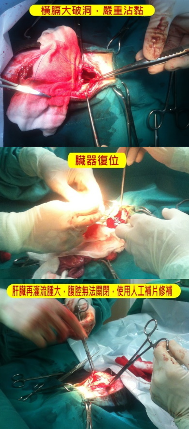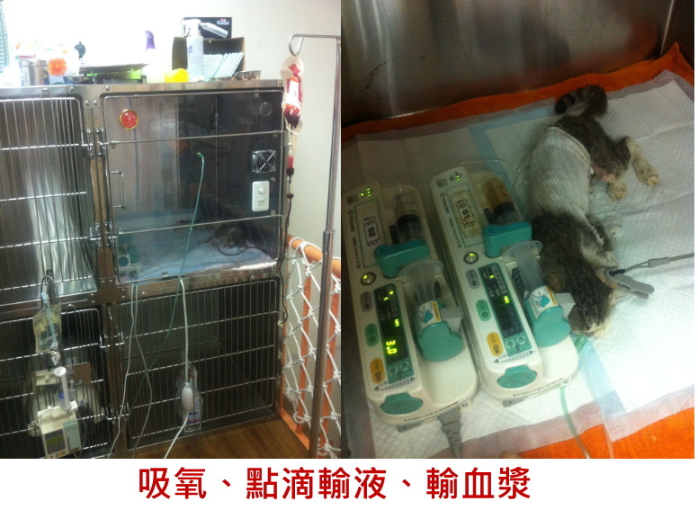 咪NO在眾多愛心接力下終於到了台北接受治療,X光檢查發現肝臟隨著破洞整個擠壓到胸腔,情況十分糟糕,若不趕快動手術一點機會都沒有,打開橫膈發現破洞很大發現沾黏的非常嚴重,器官複位之後本來沒有血液流通的肝臟迅速充血腹腔無法閉合,使用人工補片修補縫合,肝臟常時間沒有血液流通等於沒有作用,無法順利代謝麻藥,又因為臟器分離無法縫合血液滲流,需緊急輸血,謝謝陳曉霏帶六隻貓咪前往支援,配對一隻輸全血,四隻貓咪的血液做成血漿,咪no醒來的第一件事,就是撒嬌和蹭蹭,很可惜咪no出現太多的併發症,(腎功能衰退、凝血功能異常),我們沒有繼續再用輸血強力留住牠,也好好的陪牠最後一程,牠很平順、很平順的離去,牠知道有好多人很愛牠....咪no是好可愛的小鬥士,即使到最後一刻牠也沒有放棄,幸運的是牠沒有太痛苦的離開....