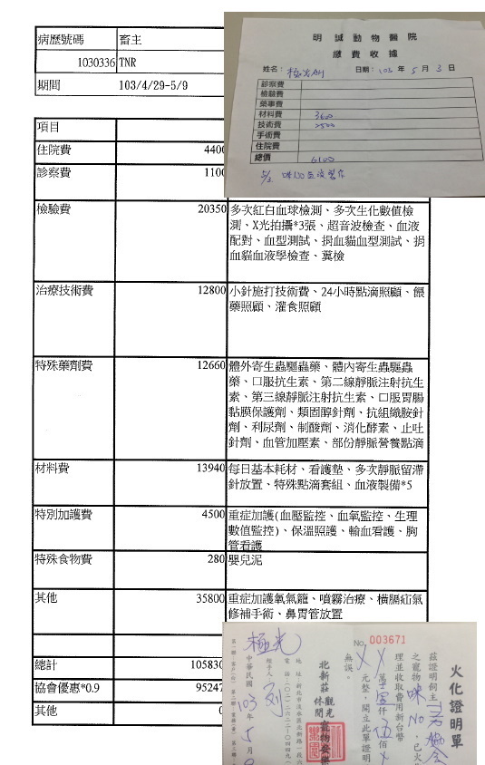 您好:我在4/7在我餵養的區域遇一隻很親人的貓咪,想自費結紮,送去醫院,醫師覺得貓咪呼吸不順,有感冒徵兆,所以沒有結紮,開了口服藥,服藥近3周貓咪沒有改善,醫師建議照X光,發現為【橫膈赫尼亞】:橫膈膜破了個洞,五臟六腑移位了,有很強烈的喘氣聲。但醫師告知無法進行手術,詢問台東其他醫院,也無解!醫師建議去外縣市手術,我因工作無法請假,幸好老天爺垂憐,有位很慈悲的貓友,願意從台東帶到台北就醫!但不知要送那一家才好…?,本人是領有低收証明的單親媽媽,可以拿出來的費用不多,但很想救這隻極親人的貓咪,由於貓咪前段醫療已花費一些費用,我只能再拿出2仟來貼補,懇求協會救救這隻貓咪,感謝協會的大恩大德!感激不盡!