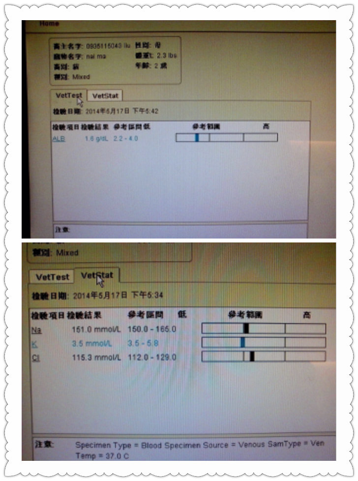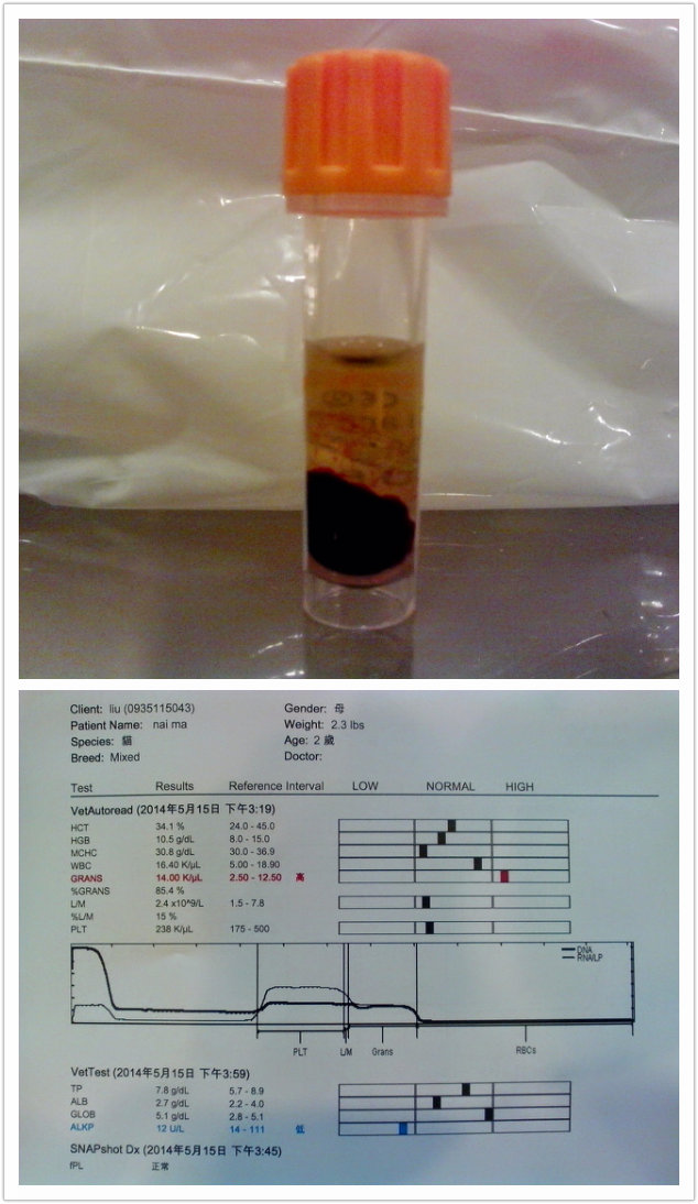 進院第三天醫院幫貓咪做第二次血檢, 追蹤 白蛋白 及離子狀況..檢查結果-肝衰竭,白蛋白不足 並開始打白蛋白 後來體溫及血壓都下降 有敗血症休克現象 醫院又連續打一瓶白蛋白 但持續拉鮮血好幾天 黃膽有改善 表示肝有比較好了 持續治療下來 貓咪在醫生那邊狀況慢慢好轉 2014/5/24 出院(感謝醫院讓貓咪後面多住幾天觀察不計算費用)
