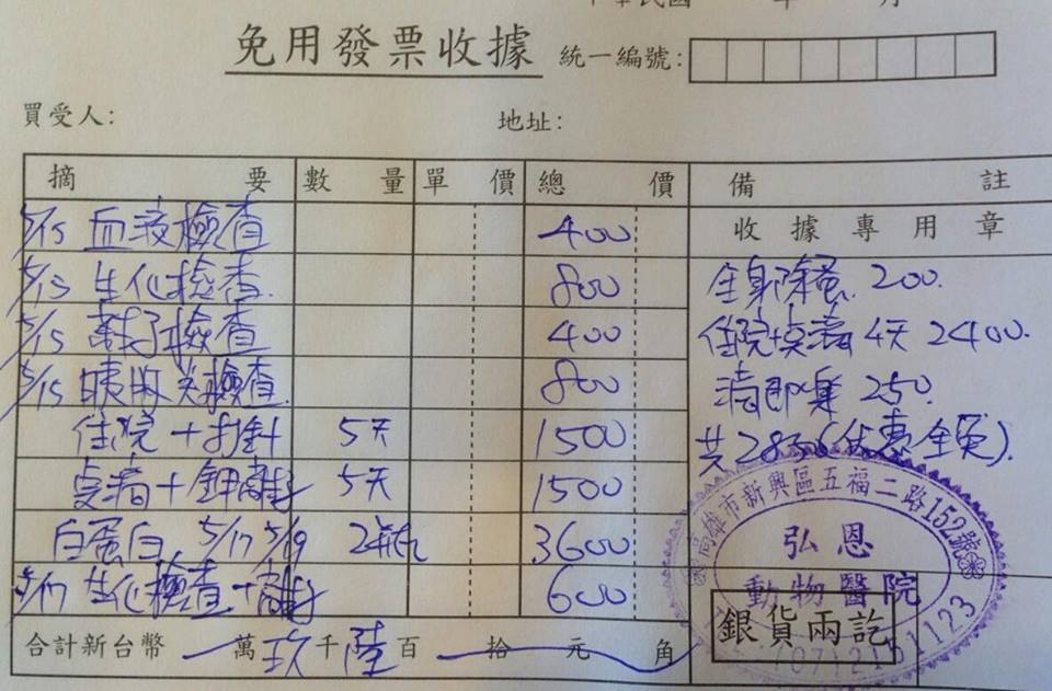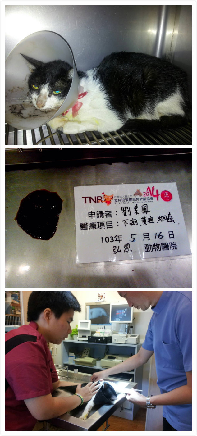 主題: 鼓山台電不吃只喝水的母貓 申請者姓名: 劉素鳳 花色: 申請日期: 2014-05-28 00:36:26 申請者部落格: 申請者臉書網址: 所在縣市/合作醫院: 高雄市/弘恩動物醫院 治療費用: 9600元 需求人數: 11人 已結案 (2014-06-20 16:35:22) 報名人員: fang7880(已付款)、Lanny Shieh(已付款)、Sybil Huang(已付款)、王妍緁(已付款)、Choco Chen(已付款)、chiawei(已付款)、Ivy Chen、Ivy Chen、Ivy Chen(已付款)、Mei Mei Liao(已付款)、魷魚、orange x3(已付款)、 候補人員: 動物病情說明: 之前在電力公司旁抓到這貓咪已懷孕非常大,所以先抓回來待產,生了4隻小貓,又代替照顧另3隻奶貓,很偉大又辛苦,但一直不太吃, 到這幾天都不吃只喝水, 造成小奶貓們也危險, 陸續生病, 趕緊帶母貓到醫院治療, 發現母貓發燒又加上有蛔蟲,嚴重下痢,黃膽(顯示有肝衰竭的現象) 另外醫生懷疑此貓有胰臟炎所以幫她做血液 生化 及胰臟炎的檢查. 血液檢查結果.發炎白血球高有細菌感染現象,胰臟炎檢查正常 ,隔天貓咪還是持續下痢,有拉惡臭的鮮血便 顯示肝受損已造成凝血障礙,治療加強肝及凝血問題
