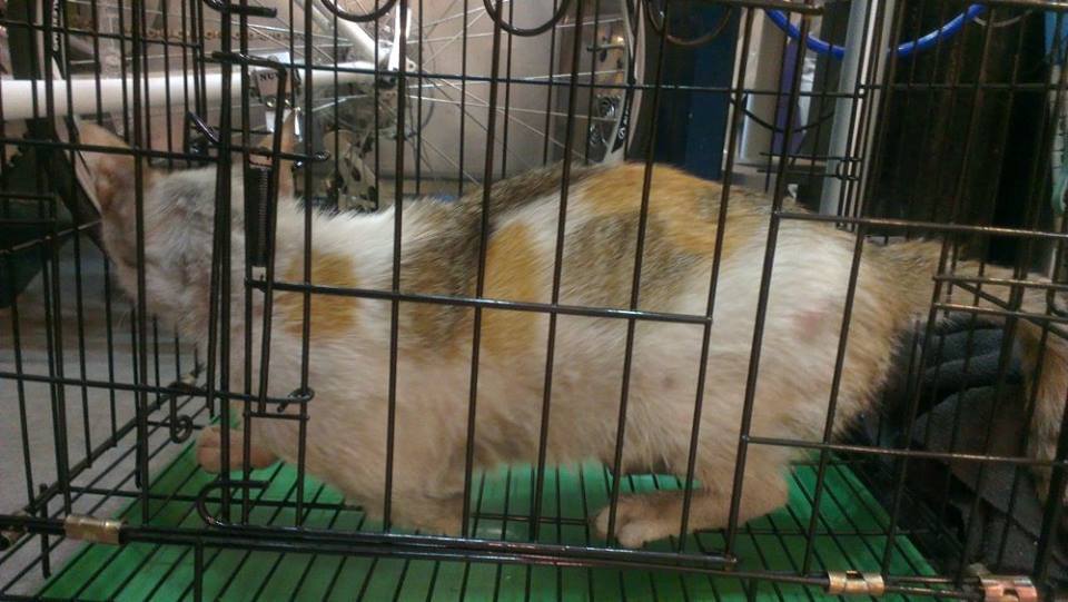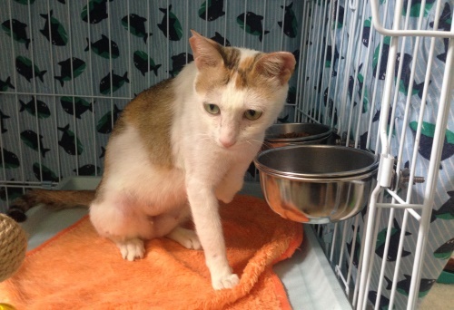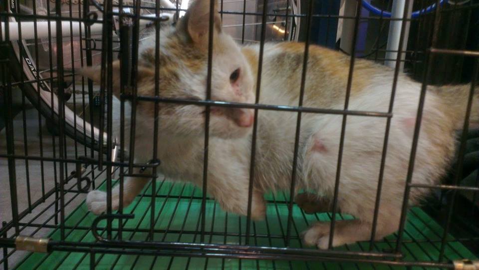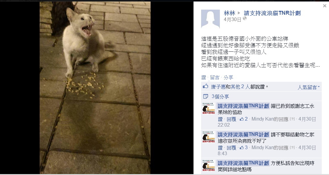 照片中的貓咪全身髒兮兮,帶著斷肢哇哇叫跟路人討食,令人心生不捨,志工黃意如(水果妹),前往捕捉,貓咪很親人一叫就來,帶到醫院檢查,發現斷肢傷口平整,應該是手術處理過,但沒有結紮,結紮醒來後,這小妮子,一整個東倒西歪猛蹭籠子,滾來滾去,完全沒有辦法拍到一張不晃的照片,就一直諂媚的撒嬌,這可憐的孩子在外面一定很辛苦,才會使出渾身解數想賴在這裡,洗澡的時候也很乖巧,就像是家貓一樣,目前貓咪檢驗愛滋白血陰性,也施打過ㄧ次三合一疫苗,很乖巧,三隻腳完全不影響他的活動力,未來將開放送養,醫療費用請大家幫忙。