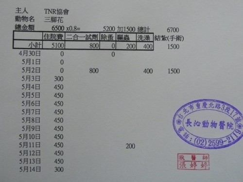 主題: 帶著斷肢在外面討食的貓咪 申請者姓名: 臺北市支持流浪貓絕育計劃協會 花色: 申請日期: 2014-05-22 13:48:24 申請者部落格: 申請者臉書網址: 所在縣市/合作醫院: 台北市/長沁動物醫院 治療費用: 6700元 需求人數: 15人 已結案 (2014-06-20 16:34:42) 報名人員: 尖頭怪(已付款)、小四 x4(已付款)、kiska huitzu(已付款)、Dora Chen x2(已付款)、Szuhan Liu(已付款)、Norn(已付款)、黃喬緯(已付款)、比比、比比 x2(已付款)、yymeow(已付款)、Jessie Lee(已付款)、 候補人員: 張慈恩、Shih Jen、 動物病情說明: 網友通報: