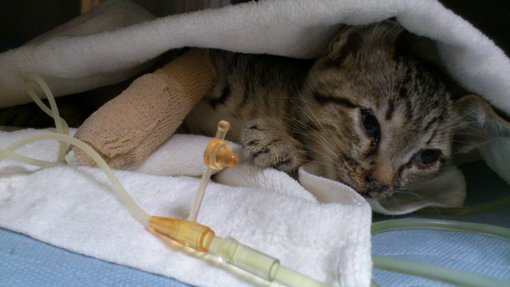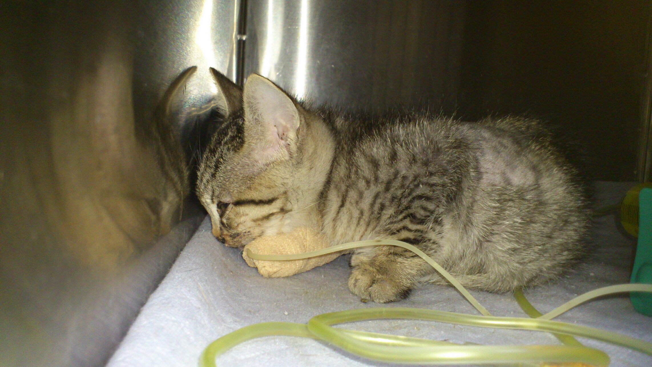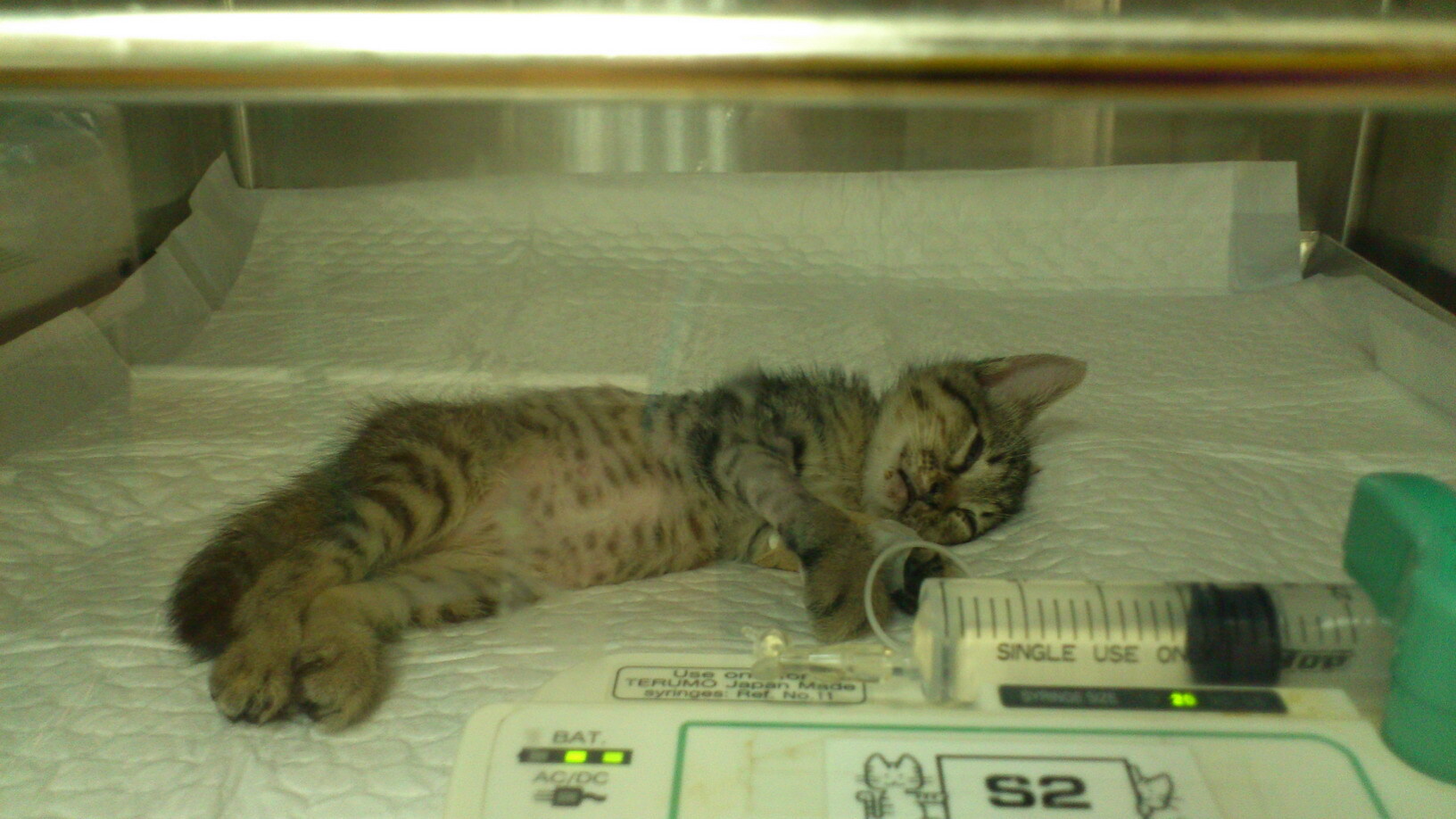 緊急打了止血針、葡萄糖針、並上點滴,讓喵喵住進氧氣保溫箱先休息。