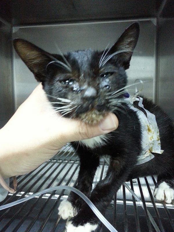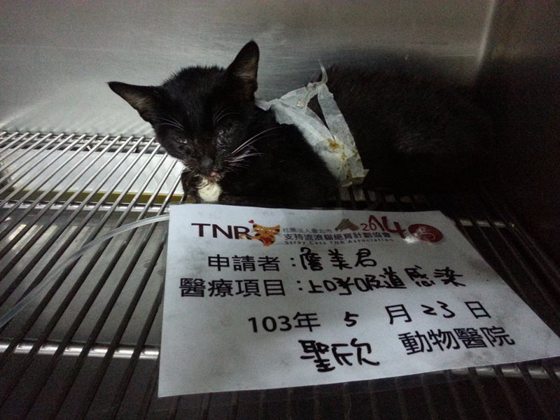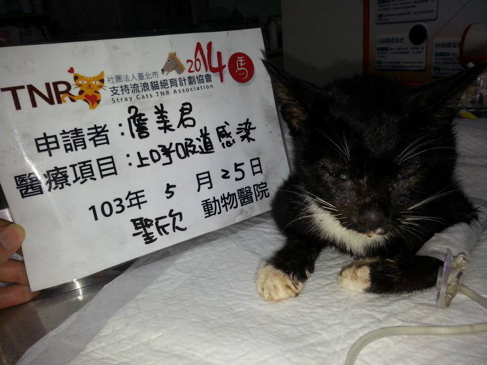初步的檢查結果,小襪子貓上吸呼道感染嚴重併發肺炎了,發燒,脫水嚴重,且還有下痢(血便),也沒有進食的欲望
