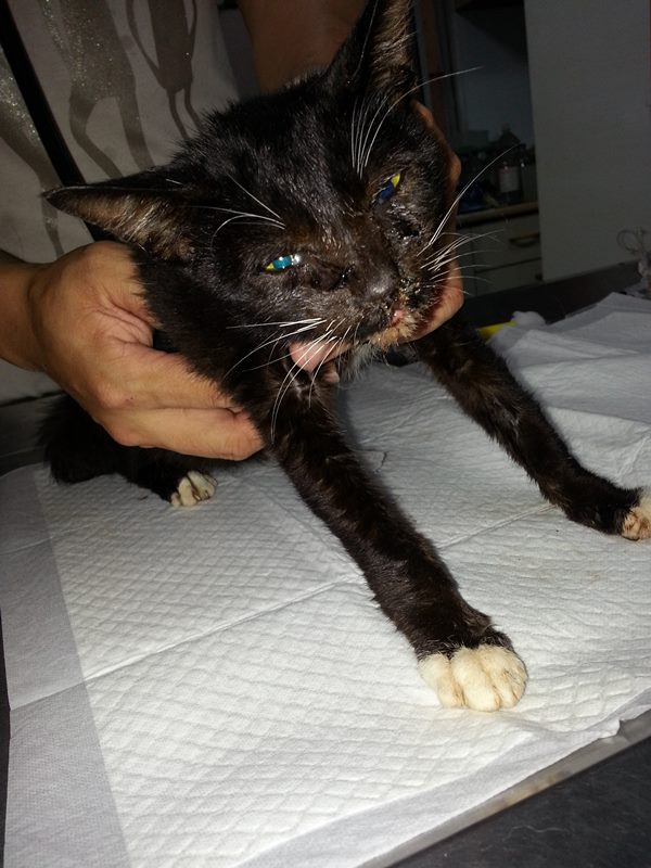 上前查看,一隻臉上佈滿鼻涕跟眼淚的小襪子貓,車上剛好有之前抓貓放進車裡的浴巾,迅速的把貓抓起來送醫.