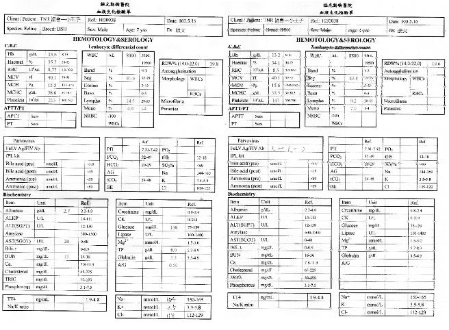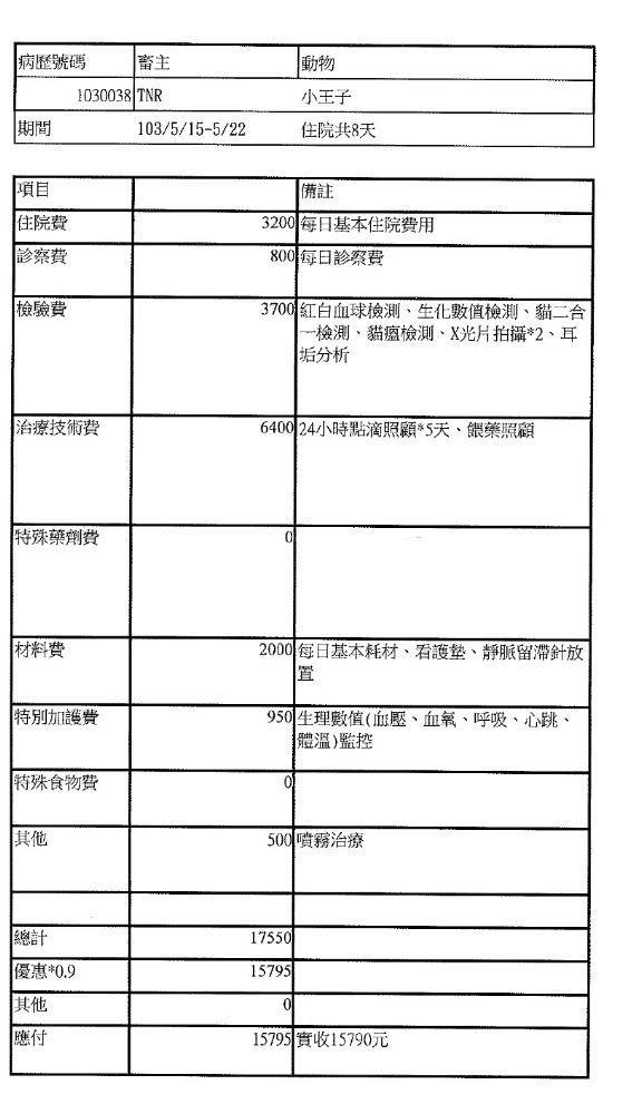 主題: 身體孱弱的小王子 申請者姓名: 臺北市支持流浪貓絕育計劃協會 花色: 申請日期: 2014-06-06 17:03:00 申請者部落格: 申請者臉書網址: 所在縣市/合作醫院: 台北市/極光動物醫院 治療費用: 15790元 需求人數: 17人 已結案 (2014-07-02 17:29:13) 報名人員: Sunny Chen x3(已付款)、葉姿纓(已付款)、米偷(已付款)、iMADOKA(已付款)、shuku點點(已付款)、Rebecca Chen(已付款)、斑比(已付款)、Candice Chao、蕭孟珣 x2(已付款)、WeiLin Chen x2(已付款)、Annie Cheng(已付款)、Bubu Wang(已付款)、小四(已付款)、叮叮(已付款)、 候補人員: 動物病情說明: 全身蒼白精神不佳的小王子,由志工捕捉送醫治療,在安養之家等待幸福,某日小王子的罐罐和飼料都沒有吃,精神不佳,軟趴趴的,緊急送醫,體溫40度,發燒、眼膿鼻淚水嚴重不肯進食,上點滴幫助退燒,給予口服抗生素治療,五天後狀況稍微穩定,拆點滴觀察一天狀況穩定,帶回協會繼續噴物治療、餵食,醫療費用還請各位幫忙。