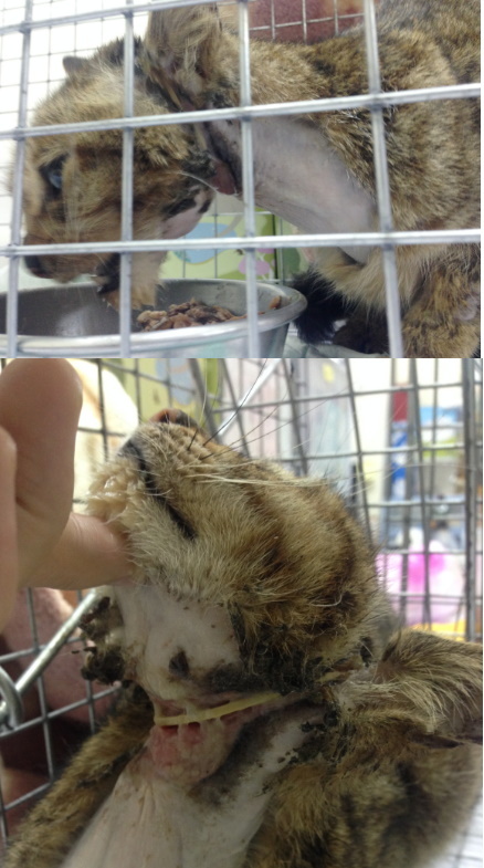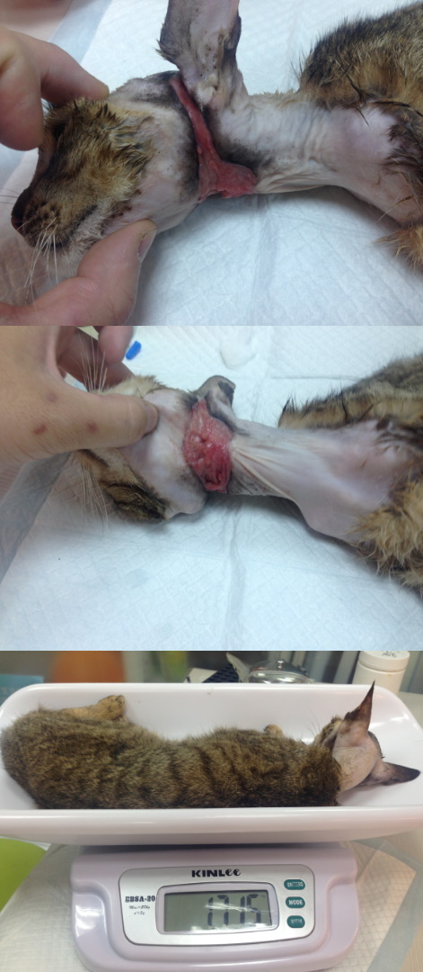 求有經驗人仕來玉成國小這救救這隻小貓,牠的脖子有條橡皮筋,已經皮開肉綻了,而且整隻已經皮包骨了,牠已無法進食了……拜託拜託