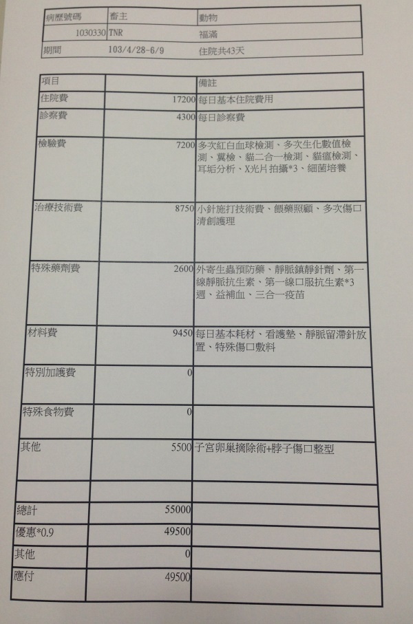 主題: 橡皮筋勒頸皮開肉綻的福滿 申請者姓名: 臺北市支持流浪貓絕育計劃協會 花色: 申請日期: 2014-06-10 19:28:06 申請者部落格: 申請者臉書網址: 所在縣市/合作醫院: 台北市/極光動物醫院 治療費用: 49500元 需求人數: 53人 已結案 (2014-08-05 11:01:45) 報名人員: Helen Yu(已付款)、Hikaru(已付款)、Amberger(已付款)、小娟(已付款)、Felina Liu(已付款)、just1943 x4(已付款)、just1943 x4、ellen pai(已付款)、櫻花妹(已付款)、Seaman(已付款)、a-wing(已付款)、Candice Chao(已付款)、Candice Chao(已付款)、Anjeli Hsieh(已付款)、alicelin x5(已付款)、惠青(已付款)、mint x2(已付款)、喵喵 x3(已付款)、Ping Meng(已付款)、夏琳(已付款)、vivian(已付款)、KAFKA(已付款)、jean chen(已付款)、Choco Chen(已付款)、hakumaio(已付款)、Yuu(已付款)、潘逸群(已付款)、aa、Irene x2(已付款)、Becca Huang(已付款)、恆均(已付款)、Mewszu Lee(已付款)、Kiki Liang(已付款)、Yuan-Hsin Kuo(已付款)、Mika Jiang(已付款)、欣格萬寶通切貨買賣公司(已付款)、小D(已付款)、Stephen(已付款)、裘爸(已付款)、Patrick x4(已付款)、小可(已付款)、 候補人員: Sunny Yang、 動物病情說明: 搶救貓兒大作戰