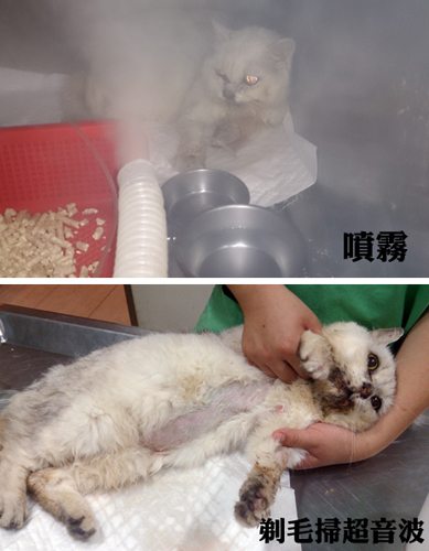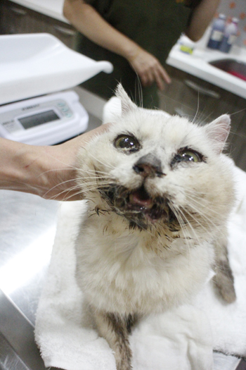 貓咪滿臉髒汙,瘦弱,脫水,口鼻都是分泌物,