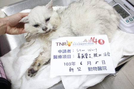 主題: 南寮收容所癱倒在籠底的金吉拉 申請者姓名: Star Wang 花色: 申請日期: 2014-06-20 20:18:08 申請者部落格: 申請者臉書網址: 所在縣市/合作醫院: 新竹市/新竺動物醫院 治療費用: 17000元 需求人數: 19人 已結案 (2014-07-17 18:48:10) 報名人員: 智捷(已付款)、Moirae x2(已付款)、貓白白(已付款)、徐雅嬪(已付款)、Suegie(已付款)、黃小奈、Ellen(已付款)、甜心倫、Cherry Lee x3(已付款)、beforn(已付款)、Soso Chiang、YiWen Lai、Kevin Wang(已付款)、Syd(已付款)、Li Chen(已付款)、姆姆(已付款)、小胖 x2(已付款)、小胖 x2(已付款)、 候補人員: 動物病情說明: 20140606