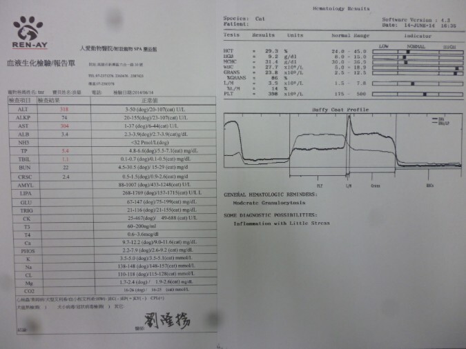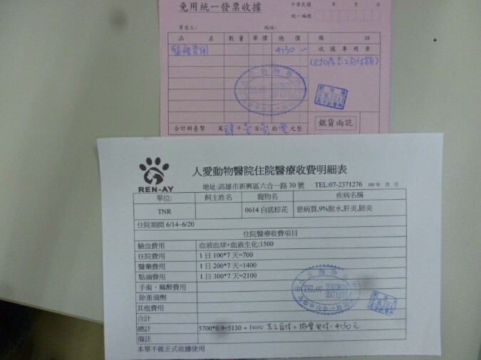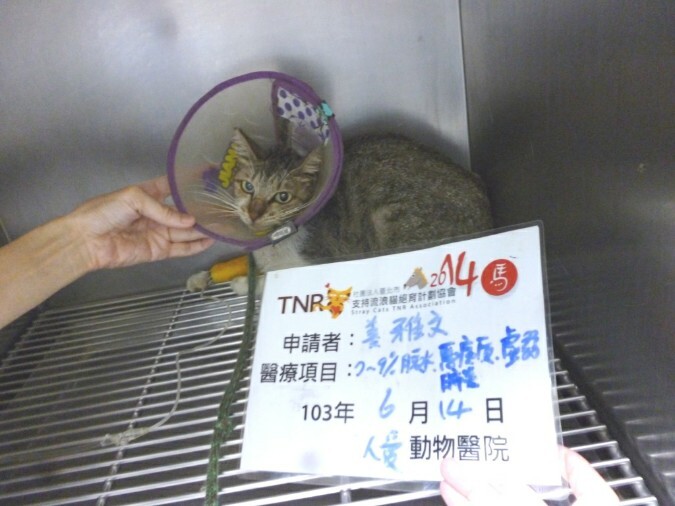 主題: 肺炎貓媽媽 申請者姓名: 姜雅文 花色: 申請日期: 2014-06-25 16:21:41 申請者部落格: 申請者臉書網址: 所在縣市/合作醫院: 高雄市/人愛動物醫院 治療費用: 4130元 需求人數: 10人 已結案 (2014-08-05 11:00:39) 報名人員: 廖千慧 x2(已付款)、olivia wu(已付款)、Muven M(已付款)、TAKOWU(已付款)、小P、小P x2、陳玟伶(已付款)、小四(已付款)、Ed Tsai x3(已付款)、 候補人員: 動物病情說明: 2014/06/13送往人愛動物醫院進行結紮醫生發現呼吸型態不正常,且有喘鳴聲,經過檢查為肺炎,肝腫大,建議需靠點滴恢復脫水及維持營養,一方面靠內科治療肺言以及肝腫大 動物近況說明: 麻醉後發覺此貓呼吸型態不正常~且有喘鳴聲~醫生手術後聽診聽見螺音與心雜音~皮膚彈性檢測及黏膜刺激微血管再充血時間少於2秒~黏膜也較蒼白~此貓也較消瘦~建議先抽血做檢查!結果白血球上升可確定為肺炎~肝腫大~建議須靠點滴恢復脫水情況及維持營養~一方面靠內科治療肺炎及肝腫大~在經過這幾天之點滴&治療~評估已可出院~但是志工願意自願讓他在留院治療觀察個幾天~這部分費用會由志工自付喔~謝謝大家的愛心