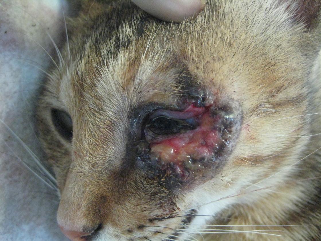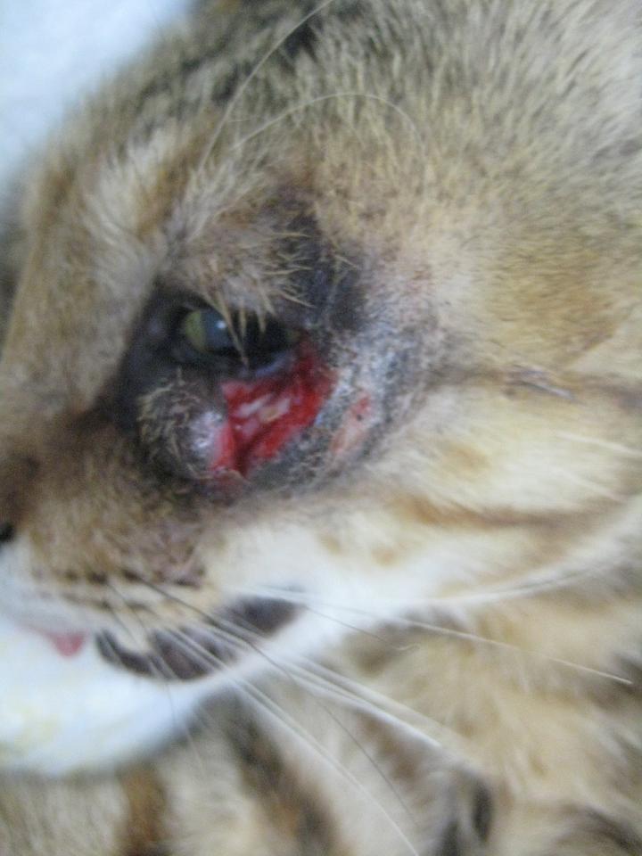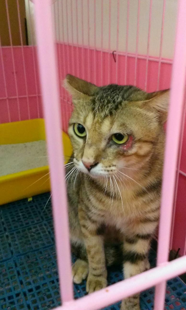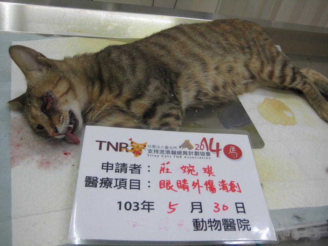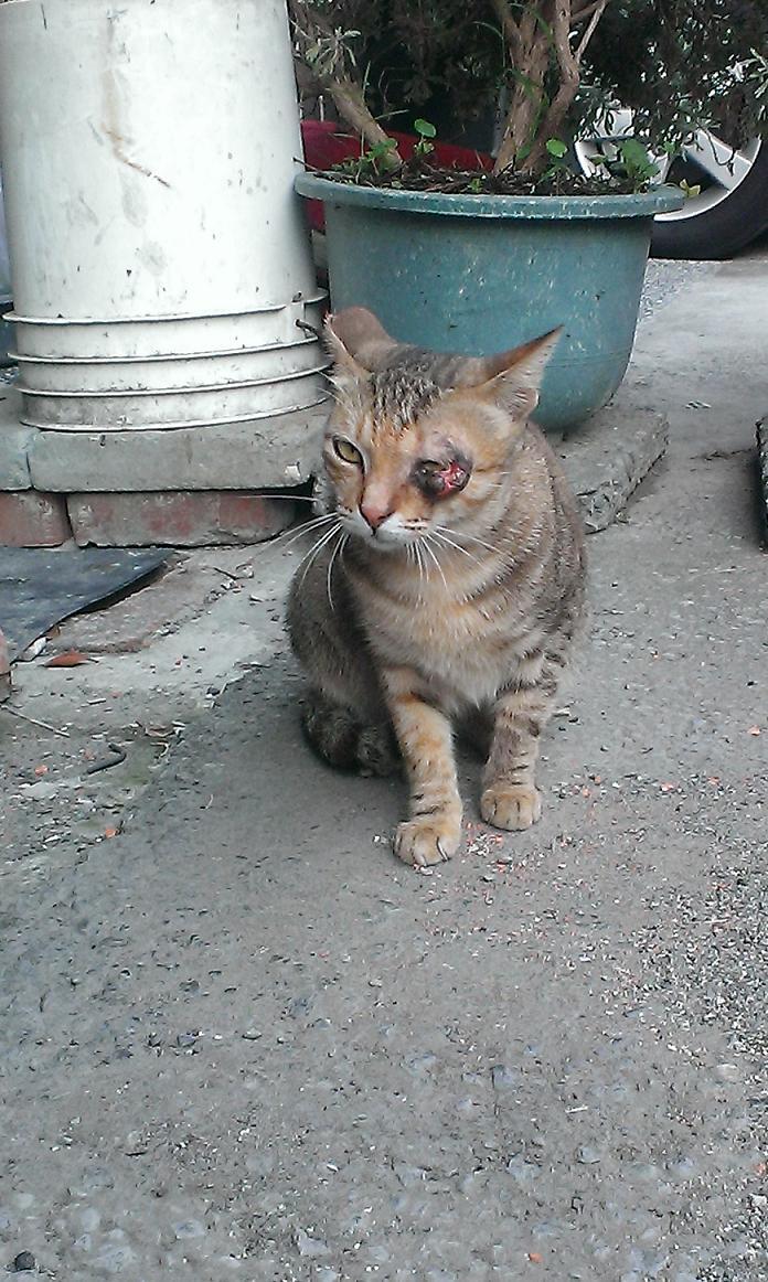 在每天晚上例行地餵養R回的貓咪時,發現了來吃飯的無名母貓一隻眼睛竟然受傷了,左眼的傷勢經由白天的觀察,看起來像是由下眼皮往眼頭方向剷起一塊皮,受傷的眼皮已經壞死發黑,擔心傷勢感染會愈來愈嚴重,花了三天才誘捕成功,送至德民動物醫院治療。