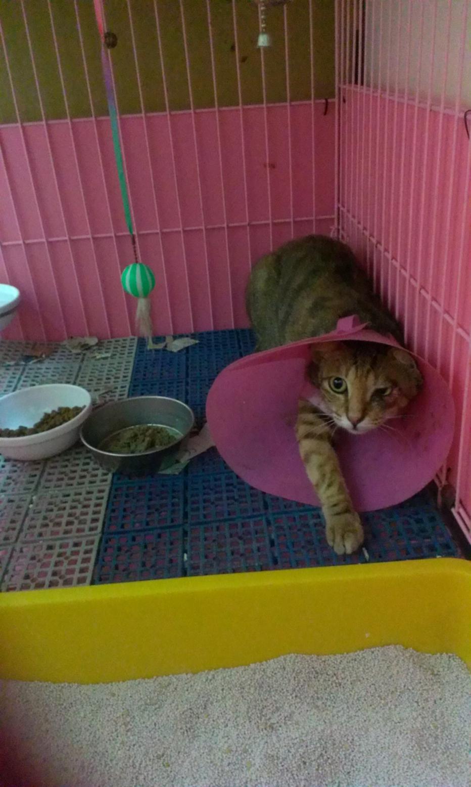 貓咪在醫院四天,不吃不喝,因此,帶回家裡的隔離房關籠觀察,傷口處仍需要時間等待復原,若是再一天依然是不吃不喝,醫院希望再帶回去住院,吊點滴治療..