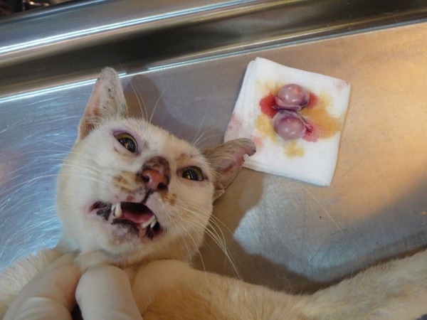 隔兩天回到原處看看是否能捕捉到口炎貓和眼疾貓,口炎貓還是呆呆看著誘捕籠不肯靠近,眼疾貓在屋頂上不肯下來,時間一分一秒過去,兩個病號完全不為所動,打算收籠時,口炎貓突然往前靠近始東蹭蹭西磨磨,雖然沾得到處都是口水,但看起來貓好像是親人的,蹲下來慢慢靠近他,他也傻呼呼的用頭頂手猛蹭,組了提藍,慢慢靠近摸摸他的頭、下巴,趁他不注意,拎起頸後塞進外出籠,送醫檢查,口腔狀況極糟,牙齦喉頭紅腫嚴重,還有鼻氣管炎,只好手術拔牙、洗牙、結紮,給予抗生素治療口炎和鼻氣管炎,治療十六已恢復健康,以後可以大口大口吃飼料。醫療費用還請各位幫忙。
