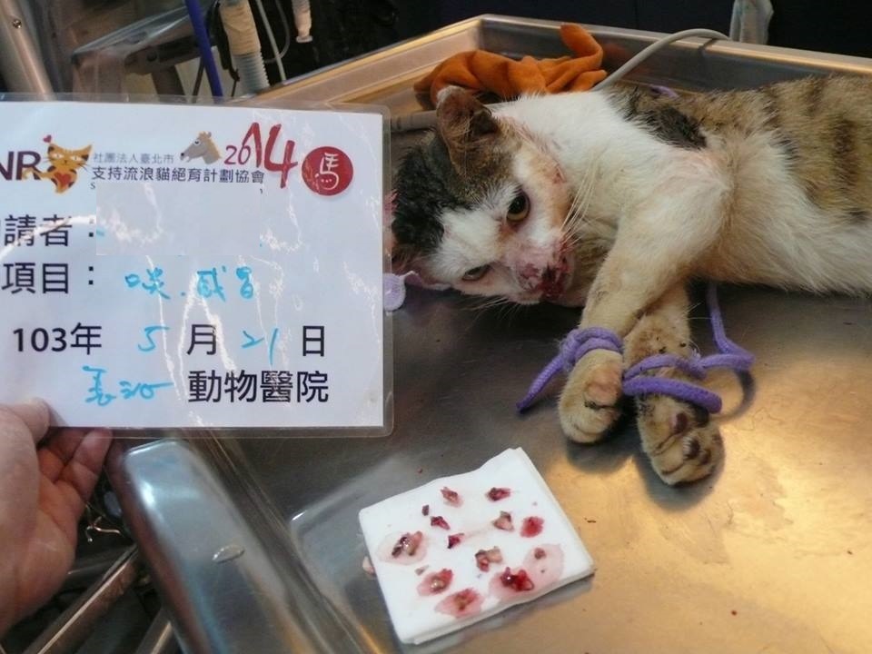 主題: 嚴重口炎+鼻氣管炎的"噗嚨共" 申請者姓名: 臺北市支持流浪貓絕育計劃協會 花色: 申請日期: 2014-06-16 18:42:10 申請者部落格: 申請者臉書網址: 所在縣市/合作醫院: 台北市/長沁動物醫院 治療費用: 8200元 需求人數: 20人 已結案 (2014-06-20 16:38:52) 報名人員: 斑比(已付款)、hsuan(已付款)、彭壯雲(已付款)、鍾怡君(已付款)、包子 x4(已付款)、PK子(已付款)、權光熙(已付款)、家有三色喵(已付款)、小瓜(已付款)、坑長(已付款)、philip x3(已付款)、陳滴咕(已付款)、樓樓(已付款)、維尼(已付款)、肉包(已付款)、 候補人員: 動物病情說明: 5/17日到臺北市內湖動物之家帶TNR里被捕捉已結紮的貓咪,R回時發現,路邊蹲坐一隻流口水的白底虎斑貓咪,看樣子應該是口炎很嚴重,設了誘捕籠,貓坐在籠子前面流著口水,呆呆望著裡面的罐頭,不離去也不進籠,看得我好著急,心想該不會已經完全沒有胃口,正在憂慮突然看見對面巷子有隻貓咪,拿手電筒一照,媽呀!眼睛有很多分泌物,完全看不見眼球,想再靠近看清楚,貓卻越跑越遠,設了誘捕籠,希望這兩個病號趕快進籠好到醫院接受治療,五分鐘後,看到另隻虎斑急急忙忙跑到誘捕籠,迫不及待衝進去,啪一聲嚇到流口水的白底虎斑,事發突然,本來還想干你屁事,我要抓口炎貓你進去幹嘛,等貓衝撞沒有那麼嚴重,手電筒一照,天呀!也是一隻口炎貓,滴滴答答的口水,這裡專出傷貓嗎?
