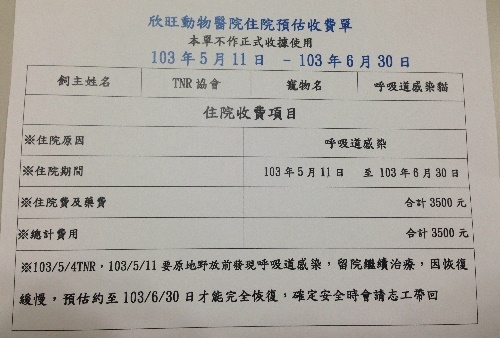 主題: 嚴重鼻氣管炎的歐香 申請者姓名: 臺北市支持流浪貓絕育計劃協會 花色: 申請日期: 2014-06-17 13:08:22 申請者部落格: 申請者臉書網址: 所在縣市/合作醫院: 台北市/欣旺動物醫院 治療費用: 3500元 需求人數: 8人 已結案 (2014-07-02 17:28:50) 報名人員: 彭壯雲(已付款)、Summer(已付款)、philip x2(已付款)、April Tsung(已付款)、Yumie Shi(已付款)、SISGO姊妹團購愛心(已付款)、小四(已付款)、 候補人員: 動物病情說明: 歐香捕捉送醫進行結紮,術後非常的緊張,在籠子裡繞圈圈,稍微靠近就整隻貓直發抖,醫師才說這麼緊迫很容易感冒,歐香就開始淚眼,給予口服抗生素治療,改善有限,慢慢進食量變少,醫師開始灌食雞肉泥,並施打抗生素,還天天換不一樣的罐頭、乾乾、還水煮小魚,希望歐香趕快恢復食慾,經過三周抗生素、噴霧治療歐香已經恢復健康,停藥觀察狀況良好可以R回,但連日大雨耽擱,反正在醫院住院這麼久,就也打了預防針,一周後6/8日早上R回原處,身子都圓了一圈。醫療費用是醫師對流浪動物的心意,沒有計每日住院費用、抗生素治療費用、灌食雞肉泥、預防針等等。