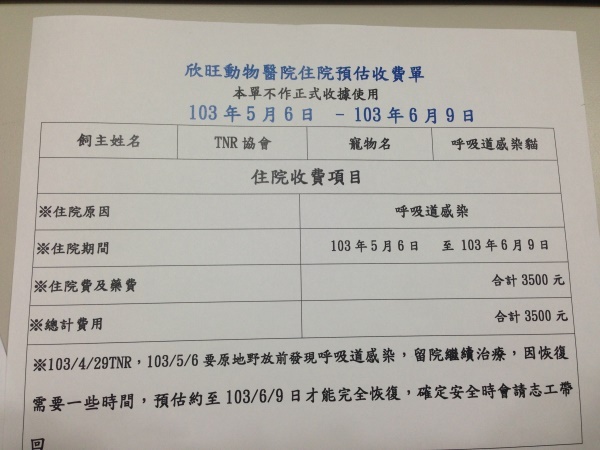 主題: 鼻氣管炎的"炭烤小妞" 申請者姓名: 臺北市支持流浪貓絕育計劃協會 花色: 申請日期: 2014-06-17 13:12:08 申請者部落格: 申請者臉書網址: 所在縣市/合作醫院: 台北市/欣旺動物醫院 治療費用: 3500元 需求人數: 8人 已結案 (2014-06-20 16:38:07) 報名人員: 彭壯雲(已付款)、Summer(已付款)、philip(已付款)、Daisy Juang x2(已付款)、小四 x3(已付款)、 候補人員: 動物病情說明: 炭烤小妞捕捉送醫進行結紮住院7天要R回時出現明顯鼻水,留院繼續治療感冒,但胃口很差都不願意進食,鼻塞有時候都仰頭呼吸,感覺很不舒服,給予抗生素和噴霧治療,搭配灌食,慢慢狀況舒緩,開始將抗生素加在罐頭裡讓貓咪吃,經過三周治療已經恢復健康,也施打疫苗,6/13日已經R回原處,療費用是醫師對流浪動物的心意,沒有計每日住院費用、抗生素治療費用、灌食雞肉泥、預防針等等。