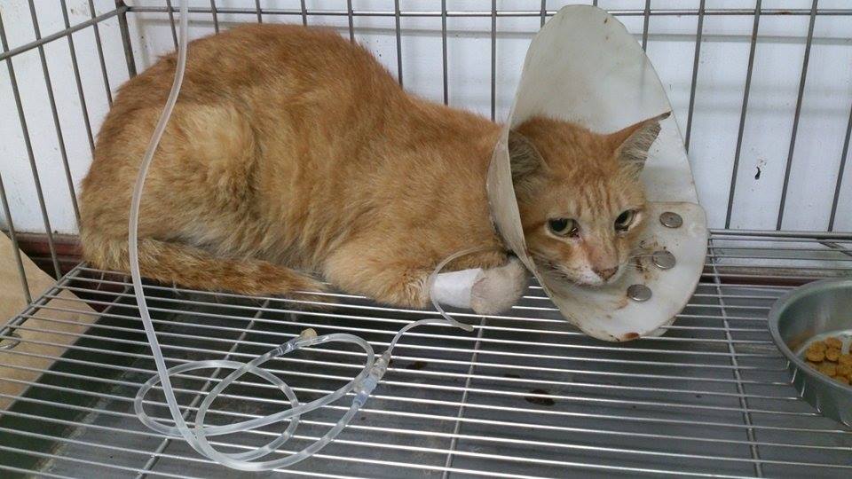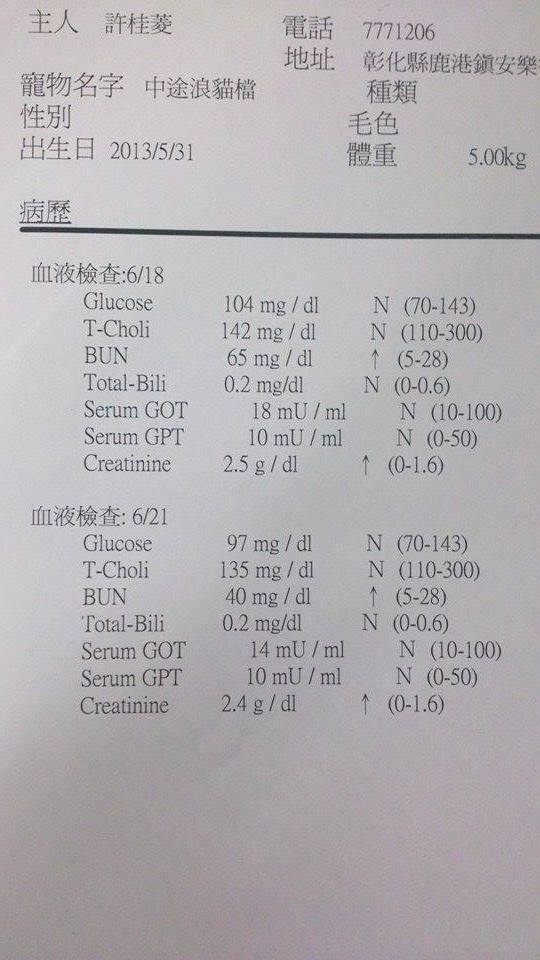 主題: 發燒+貧血+腎衰的愛滋橘虎斑 申請者姓名: 許桂菱 花色: 申請日期: 2014-07-04 12:30:05 申請者部落格: 申請者臉書網址: 所在縣市/合作醫院: 彰化縣/成愛動物醫院 治療費用: 6670元 需求人數: 8人 已結案 (2014-08-05 11:00:17) 報名人員: Mountain Deng(已付款)、胡嘟嘟(已付款)、SASA(已付款)、Victoria Liou x2(已付款)、Alice Tsai(已付款)、吉兒(已付款)、小四(已付款)、 候補人員: 動物病情說明: 長期餵養快3年的媽祖廟浪貓,連日來食慾不振,最後連罐頭都沒反應,當下心中頓時不安,於是先向附近貓友借用外出籠,平時大目仔是碰不得,只要太靠近就會快速跑掉,但此時卻虛弱可徒手推入籠!緊急送醫先做生化及二合一血檢,中貓愛滋陽性,貧血又腎衰,先以輸液治療並補充貧血及增加免疫之營養品!