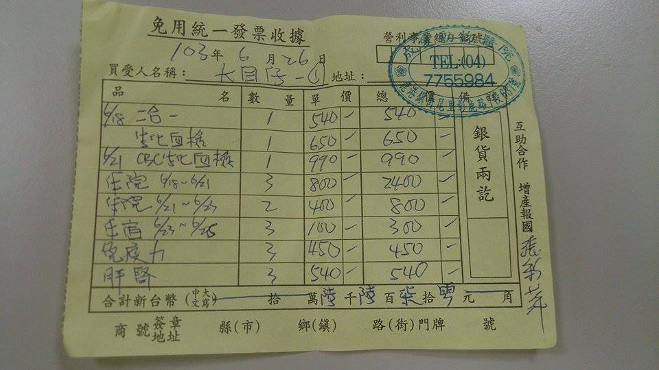總計醫療費用共7,040元,由志工支付370元補血品,故醫療費用為6,670元