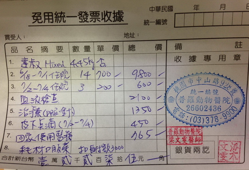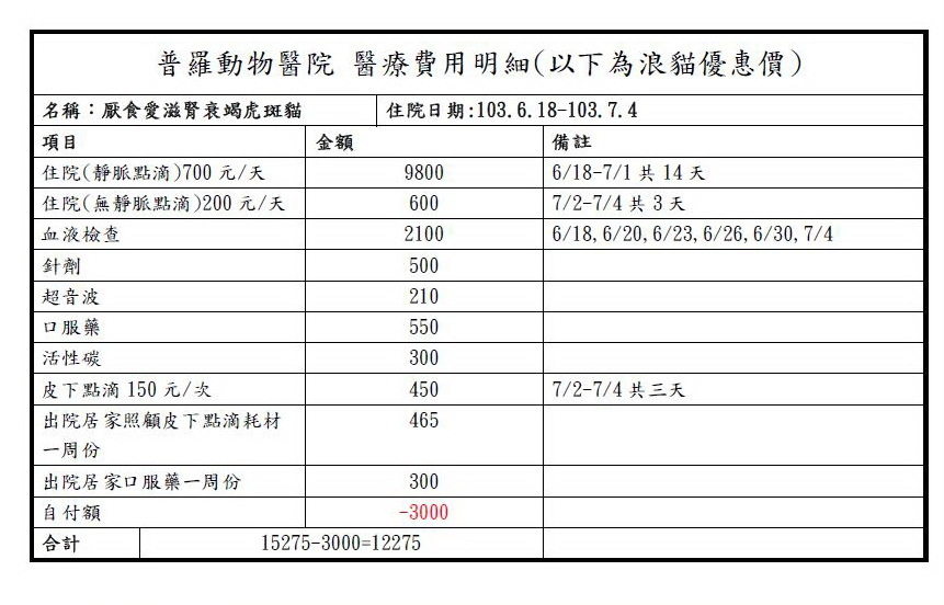 費用部份,入院時的二合一檢驗,及三仟元的自付額,處方飼料,由我負擔,其它不足的部份還請大家多多幫忙,謝謝協會出手相助,讓這孩子能得到很好的醫療照顧。