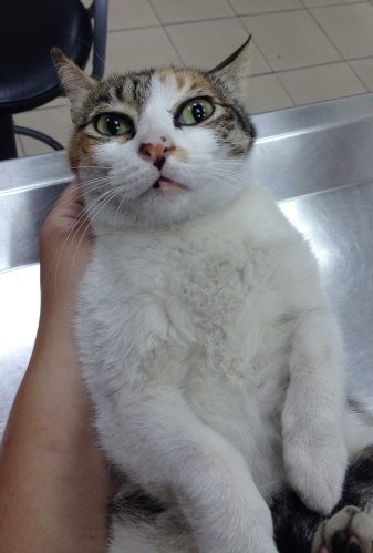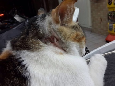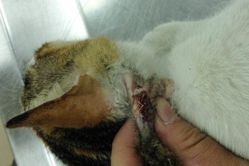 志工當晚前去捕捉,外面下著大雨,本來還擔心貓不會出現,到達現場看到三花貓咪在摩托車坐墊上休息,嘗試要靠近,他會有點害怕左閃右閃,雖然親人但還是會怕怕的,無法順利捕捉,全家大夜班的安安小姐,看到後主動協助將貓咪推進提籃,進籠後貓咪大聲哭泣哀嚎,吵得不得了,隔日送醫,醫生剃開毛發現,傷口雖然不大,但很深,用力一擠膿血就流出來,用碘酒液灌洗傷口,發現注入2CC多,裡面有個小空腔,大小看起來應該是貓咪咬傷,在靠近下巴的地方也有傷口,先留院治療,給予口服生素治療,恢復狀況不好,又開始友鼻水淚水,食慾不振,看起來很倦怠,打水灌食兩天後慢慢願意吃加藥的罐頭,持續給予抗生素,但傷口復原極慢,經過一個月的治療總算完全康復,醫療費用還請各位幫忙。