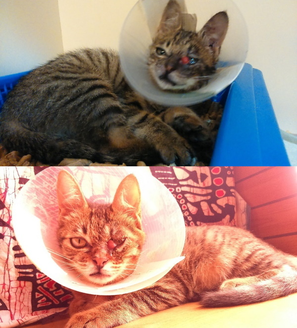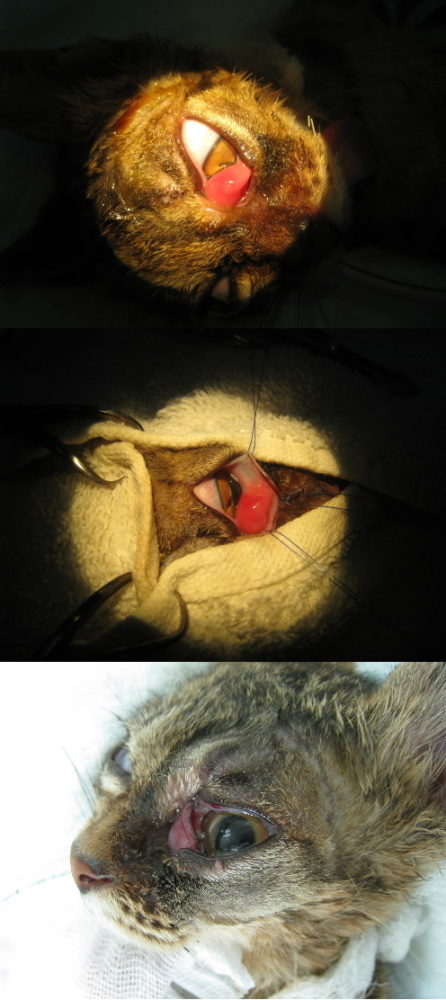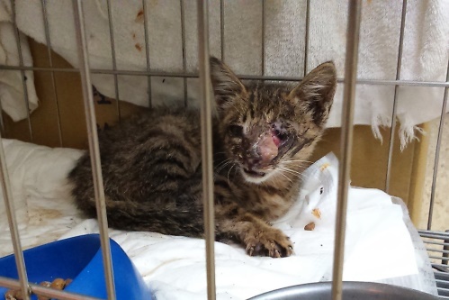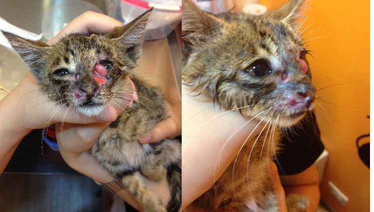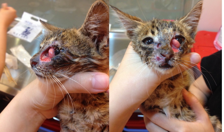 看到牠時,牠兩眼全都黏住,鼻子左右都有大洞,右臉眼睛下有很大的傷口,膿水不斷流出來,眼角缺損嚴重,右眼的內眼瞼腫大外露。但牠生命力很強,不斷喊叫求助。