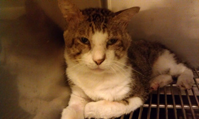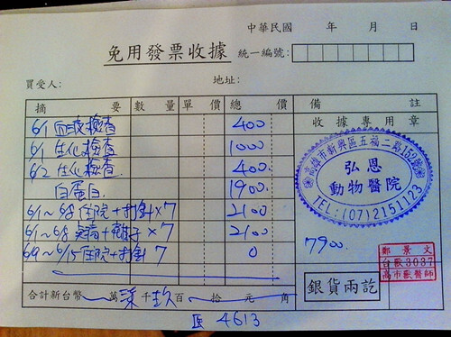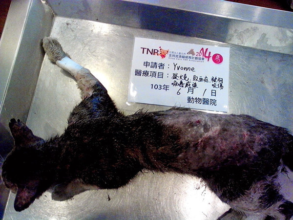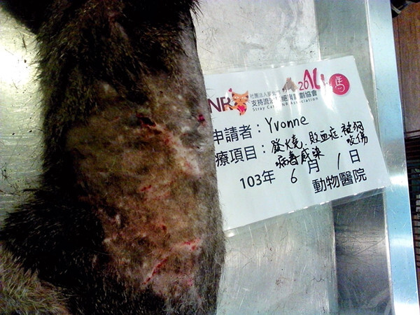 清晨出門在一家自助餐前看到這隻貓咪,不肯吃也不太動,但仍清醒,背上的毛溼溼的並糾結在一起,身上似乎也有一些傷口,狀況真的很不好,實在不敢輕乎!於是,我趕緊先回家拿了外出籠將牠送至弘恩動物醫院,醫生檢查過後發現牠正在發燒,温度約有41度,被咬傷多日,有細菌性敗血症,口鼻分泌物多,瞬膜突出(病毒感染),血液檢查QBC 生化檢查 alt 410(12-130)肝發炎,晚上開始拉惡臭的黑色泥便(凝血不良),同時發現有肝炎及腸胃炎