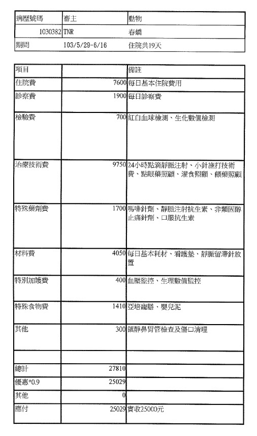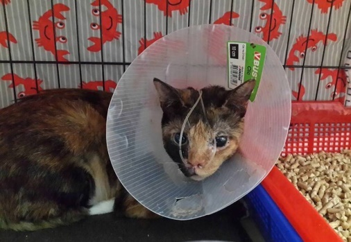 春嬌非常乖如此重傷也沒攻擊行為,醒來厚也只是縮著一直哭,令人心疼,術後第三天醫師調整點滴,春嬌整隻貓黏過去,蹭蹭、呼嚕嚕,一會又踏踏,真的很親人,術後春嬌復原狀況良好,現在已經能夠吃一些軟質的東西,偶爾會有點嗆到,但還是吃得很開心,現在稍微穩定已經帶回安養之家照顧,醫療費用還請各位幫忙。