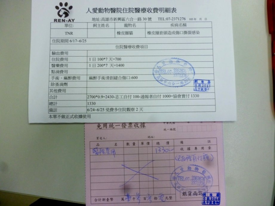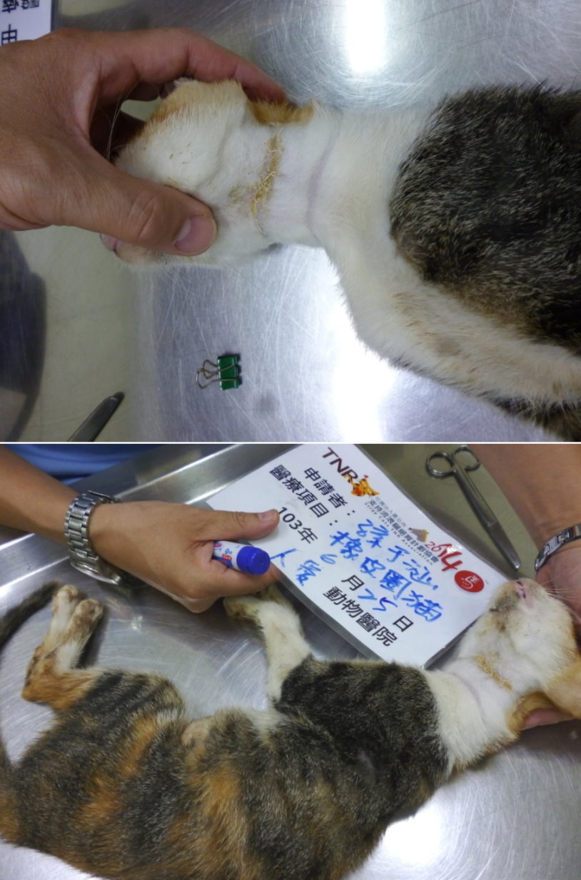 主題: 高雄灣中街民眾通報橡皮筋貓 申請者姓名: 孫于涵 花色: 申請日期: 2014-06-28 20:50:23 申請者部落格: 申請者臉書網址: 所在縣市/合作醫院: 高雄市/人愛動物醫院 治療費用: 1330元 需求人數: 2人 已結案 (2014-07-02 17:28:39) 報名人員: 梁咪子 x2(已付款)、 候補人員: 動物病情說明: 此貓為民眾通報協會的案件