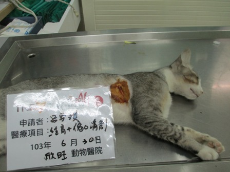 主題: 右側腹蓄濃傷口的灰白貓咪 申請者姓名: 呂安琪 花色: 申請日期: 2014-07-16 23:46:23 申請者部落格: 申請者臉書網址: 所在縣市/合作醫院: 台北市/欣旺動物醫院 治療費用: 6400元 需求人數: 8人 已結案 (2014-08-05 11:04:16) 報名人員: 小朱(已付款)、lllee0812 x2(已付款)、果子林(已付款)、loveso(已付款)、shuku點點 x3(已付款)、 候補人員: 動物病情說明: 1.右胸腹部傷口蓄膿