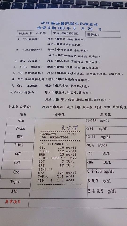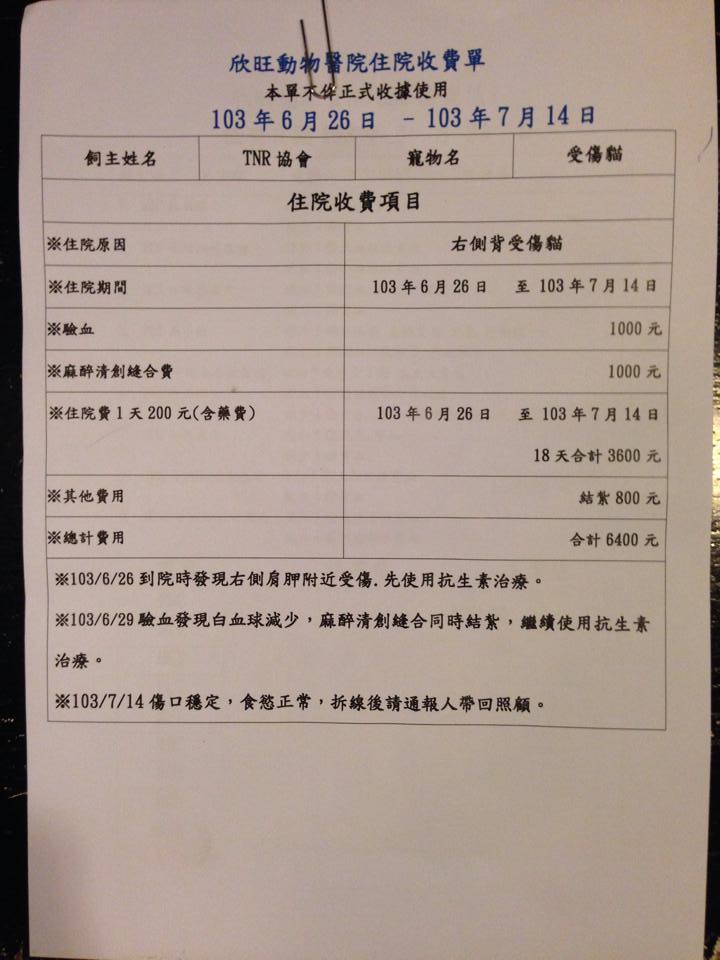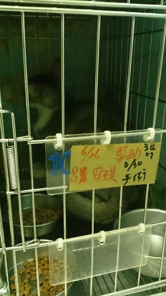 6/26(四)晚上抓了兩小時終於抓到,順利於22:00送至欣旺動物醫院,張醫師馬上檢查並說明會先使用抗生素治療,並說明需要先住院觀察。