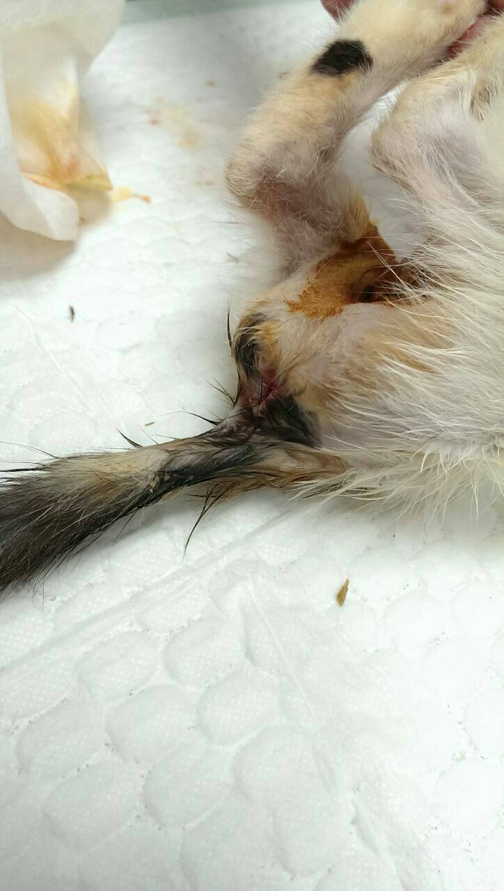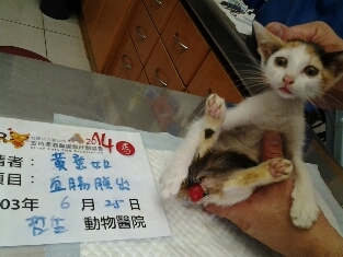 主題: 菜市場裡嚴重脫肛的三花妹 申請者姓名: 黃意如 花色: 申請日期: 2014-07-08 12:51:55 申請者部落格: 申請者臉書網址: 所在縣市/合作醫院: 新北市/哲生動物醫院 治療費用: 8500元 需求人數: 10人 已結案 (2014-08-05 11:04:12) 報名人員: seesaw037(已付款)、Yang Hsu(已付款)、小瓜(已付款)、小P(已付款)、可樂兒、可樂兒(已付款)、Carrie Wu(已付款)、皮皮&米漿(已付款)、潔莎(已付款)、斑比(已付款)、shuku點點(已付款)、 候補人員: 動物病情說明: 淡水區民族路29巷菜市場裡,發現一隻貓媽媽帶著4隻花色不同的貓小孩,其中一隻小三花居然被狗追著跑,上前去趕狗時,發現小花妹尾巴下面露出一截紅色的直腸,心想大事不妙,趕緊衝去徒手抓起小花妹。送醫後,醫生做完初部的清潔,先試著用手將直