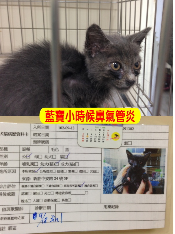 主題: 打噴嚏流膿血、眼膿的藍寶 申請者姓名: 臺北市支持流浪貓絕育計劃協會 花色: 申請日期: 2014-07-02 19:38:11 申請者部落格: 申請者臉書網址: 所在縣市/合作醫院: 台北市/極光動物醫院 治療費用: 4630元 需求人數: 11人 已結案 (2014-08-05 11:02:52) 報名人員: 小四 x2(已付款)、詹曉青(已付款)、山豬小孩(已付款)、Emily x2(已付款)、黃翠娥 x3(已付款)、Vanessa Cheng(已付款)、Hui Hui Ting(已付款)、 候補人員: 動物病情說明: 102/9/26從新北收容所帶出嚴重鼻氣管炎的藍寶,當天血檢白血球高達五萬九,有輕微腹瀉,糞檢有球蟲、絛蟲,除了給予抗生素和噴霧治療,早晚還必需灌食,慢慢小藍寶鼻氣管炎症狀減緩,稍稍恢復食慾,但還是有貧血的症狀,早晚要吃兩次倍補血和噴霧,照顧至今快一年,小藍寶也長成4.8公斤的大帥哥,可天氣一變化,打噴嚏帶血、眼膿、倦怠,有時還會發燒,體質比較虛弱,常常要跑醫院醫療,藍寶英俊瀟灑又溫柔體貼,每隻貓咪都喜歡他,跟小雪白追逐遊戲,又靠著嚕媽休憩,最近還跟勇哥(阿勇)變成好兄弟,宜家宜貓,希望藍寶趕快找到他的幸福,回診醫療費用還請各位幫忙