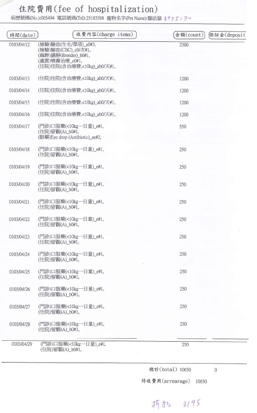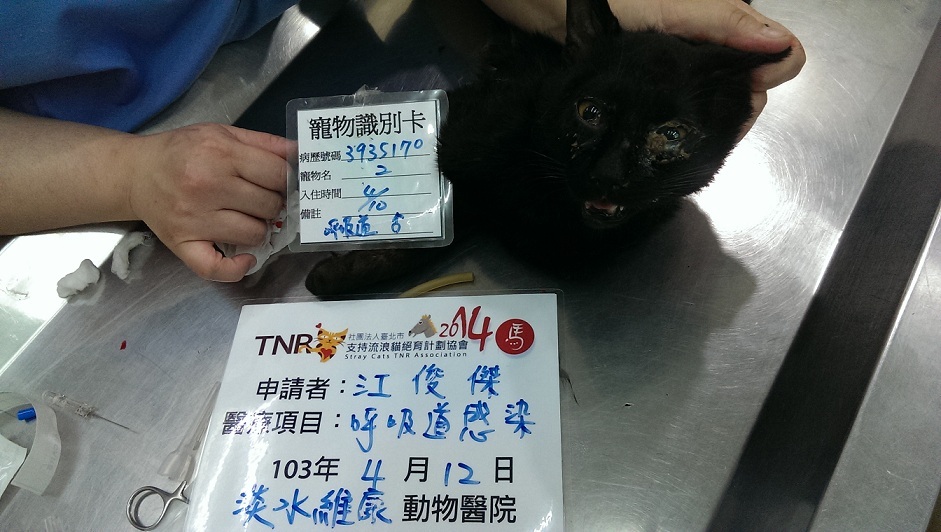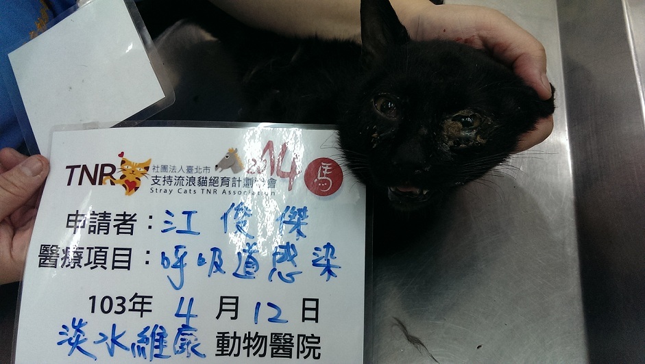 主題: 4/9新莊收容所帶出嚴重呼吸道問題黑喵 申請者姓名: 臺北市支持流浪貓絕育計劃協會 花色: 申請日期: 2014-07-04 12:08:10 申請者部落格: 申請者臉書網址: 所在縣市/合作醫院: 新北市/維康動物醫院 治療費用: 7455元 需求人數: 17人 已結案 (2014-08-05 11:01:54) 報名人員: 王道凱(已付款)、yvonne(已付款)、楊齊拉(已付款)、皮皮&米漿(已付款)、FiFi(已付款)、reiko(已付款)、Yu Ting Tseng(已付款)、凱特(已付款)、MiSty Fang(已付款)、MiSty Fang(已付款)、Chris Chiu(已付款)、Xian Tseng(已付款)、惠青(已付款)、Gina Pan(已付款)、Bonnie Lee(已付款)、馮煜鈞(已付款)、吳雅惠(已付款)、 候補人員: 動物病情說明: 4/9協會從新莊收容所帶出21隻喵喵,