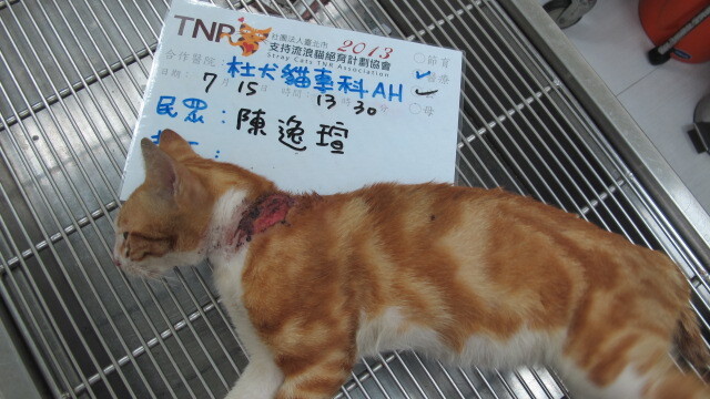 7/12的晚上我無意間在我家附近看到一隻脖子有大片開放性傷口的大橘