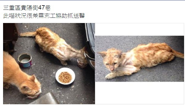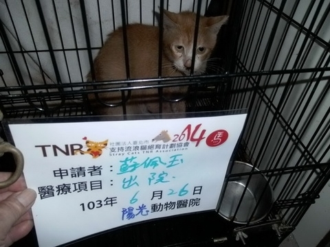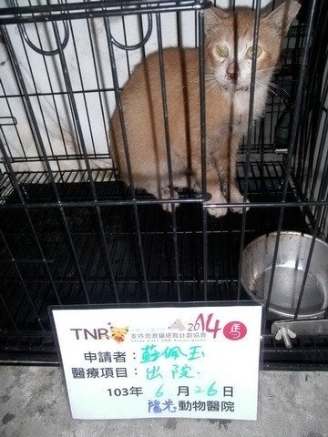 主題: 鼻膿流口水的橘貓 申請者姓名: 臺北市支持流浪貓絕育計劃協會 花色: 申請日期: 2014-07-16 16:08:07 申請者部落格: 申請者臉書網址: 所在縣市/合作醫院: 台北市/陽光犬貓專科醫院 治療費用: 3000元 需求人數: 7人 已結案 (2014-08-05 11:01:15) 報名人員: 林書妤(已付款)、philip x2(已付款)、Yu-Ling Yang(已付款)、Jill Shih(已付款)、certifi x2(已付款)、 候補人員: 蘇佩玉、 動物病情說明: 民眾通報:三重區貴陽街47巷,有貓咪狀況很差需志工協助抓送醫,志工蘇小姐特別從台北趕到三重支援,目標傷貓並無出現,但照片中另一隻頭低低的橘貓,掛著鼻膿流著口水呆呆站在路邊,趕緊架設誘捕籠,準備捕捉就醫,本來看貓咪已經剪耳,會不敢靠近誘捕籠,還好貓笨笨的,不久就進籠,口水哥再治療十五天,沒有鼻膿也不再流口水,已經完全恢復健康,由志工R回,共治療15天總醫療費用3000元還請大家幫忙。