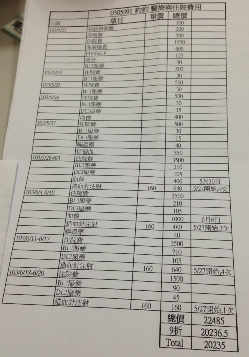 豹豹有血巴東蟲已完成治療、另外腎有點發炎需兩天打一次皮下,一個星期需回診一次