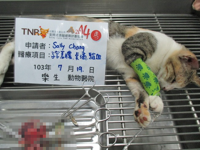 主題: 子宮蓄膿的貓媽媽 申請者姓名: Sally Chang 花色: 申請日期: 2014-08-07 19:05:04 申請者部落格: 申請者臉書網址: 所在縣市/合作醫院: 高雄市/樂生動物醫院 治療費用: 6900元 需求人數: 8人 已結案 (2014-08-26 15:02:32) 報名人員: 思惟宗道(已付款)、鍾佳臻 x7(已付款)、 候補人員: 動物病情說明: 貓基地一帶的貓咪,