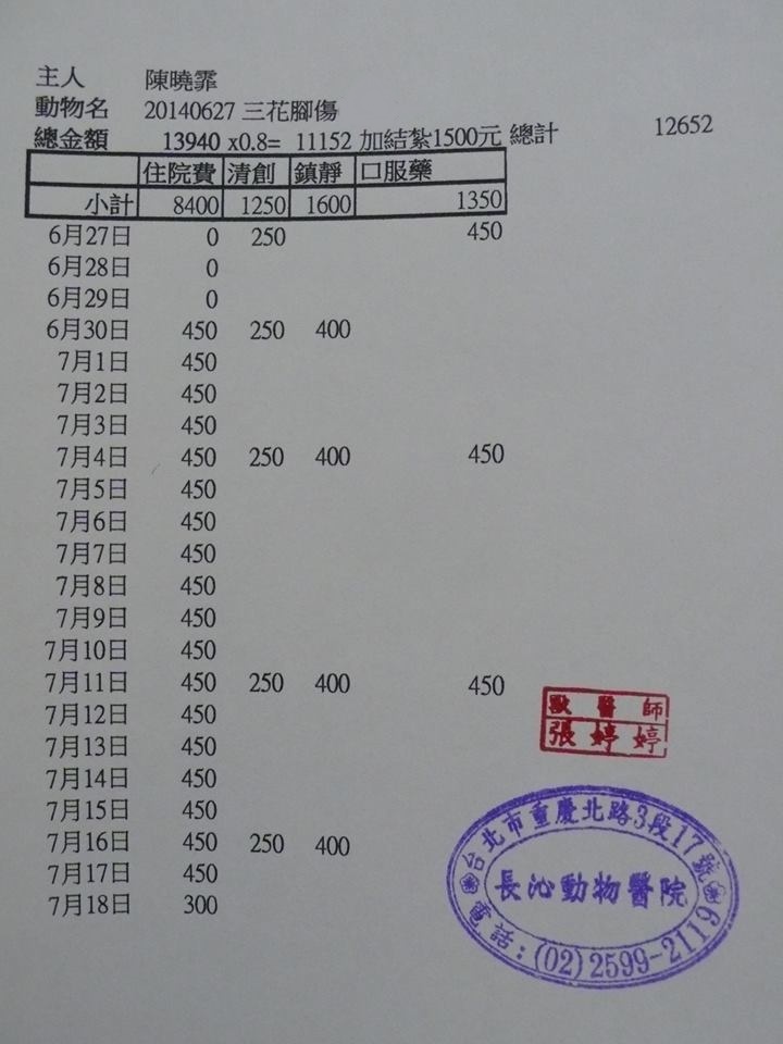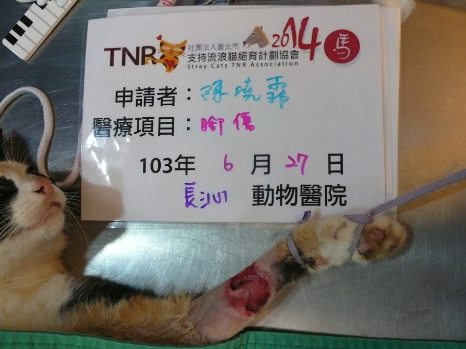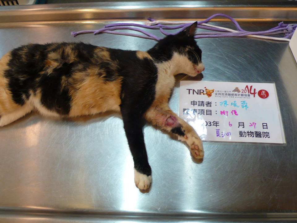 主題: 路邊跛腳母貓 申請者姓名: 陳曉霏 花色: 申請日期: 2014-08-06 17:43:22 申請者部落格: 申請者臉書網址: 所在縣市/合作醫院: 台北市/長沁動物醫院 治療費用: 12652元 需求人數: 14人 已結案 (2014-08-26 15:02:26) 報名人員: 條條媽(已付款)、ivy0934(已付款)、mint(已付款)、蘇小吉(已付款)、WeiLin Chen x2(已付款)、彩虹(已付款)、黃儀婷、黃儀婷(已付款)、JO(已付款)、Ingriddec Wang、Ingriddec Wang(已付款)、Chunyao Chao(已付款)、Daa Lai(已付款)、陳昱先(已付款)、victoria yen(已付款)、 候補人員: 動物病情說明: 總是會在固定時間來吃飯