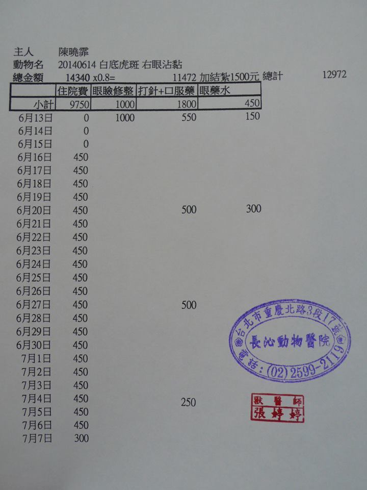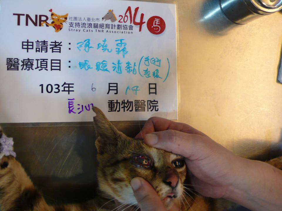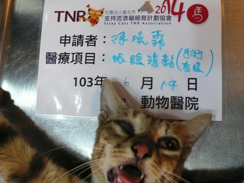 主題: 眼睛沾粘流浪媽媽 申請者姓名: 陳曉霏 花色: 申請日期: 2014-07-24 17:32:03 申請者部落格: 申請者臉書網址: 所在縣市/合作醫院: 台北市/長沁動物醫院 治療費用: 12972元 需求人數: 14人 已結案 (2014-08-26 15:02:09) 報名人員: Joy Lin(已付款)、Judy hg(已付款)、NAI(已付款)、Jean Yang(已付款)、Shan Shi Lai(已付款)、戀糖bear(已付款)、Angel Chen(已付款)、ZLIN(已付款)、Percy Wu(已付款)、莎莎醬(已付款)、懂懂沒(已付款)、李小諾、ERic YU(已付款)、賴怡嵐、星慧吳(已付款)、Shirley Tsai(已付款)、 候補人員: 動物病情說明: 原是要TNR的母貓